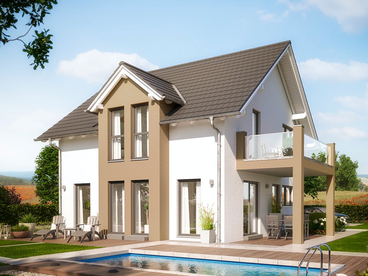 Modernes Traumhaus mit Satteldach-Querhaus und Terrassen-Balkon