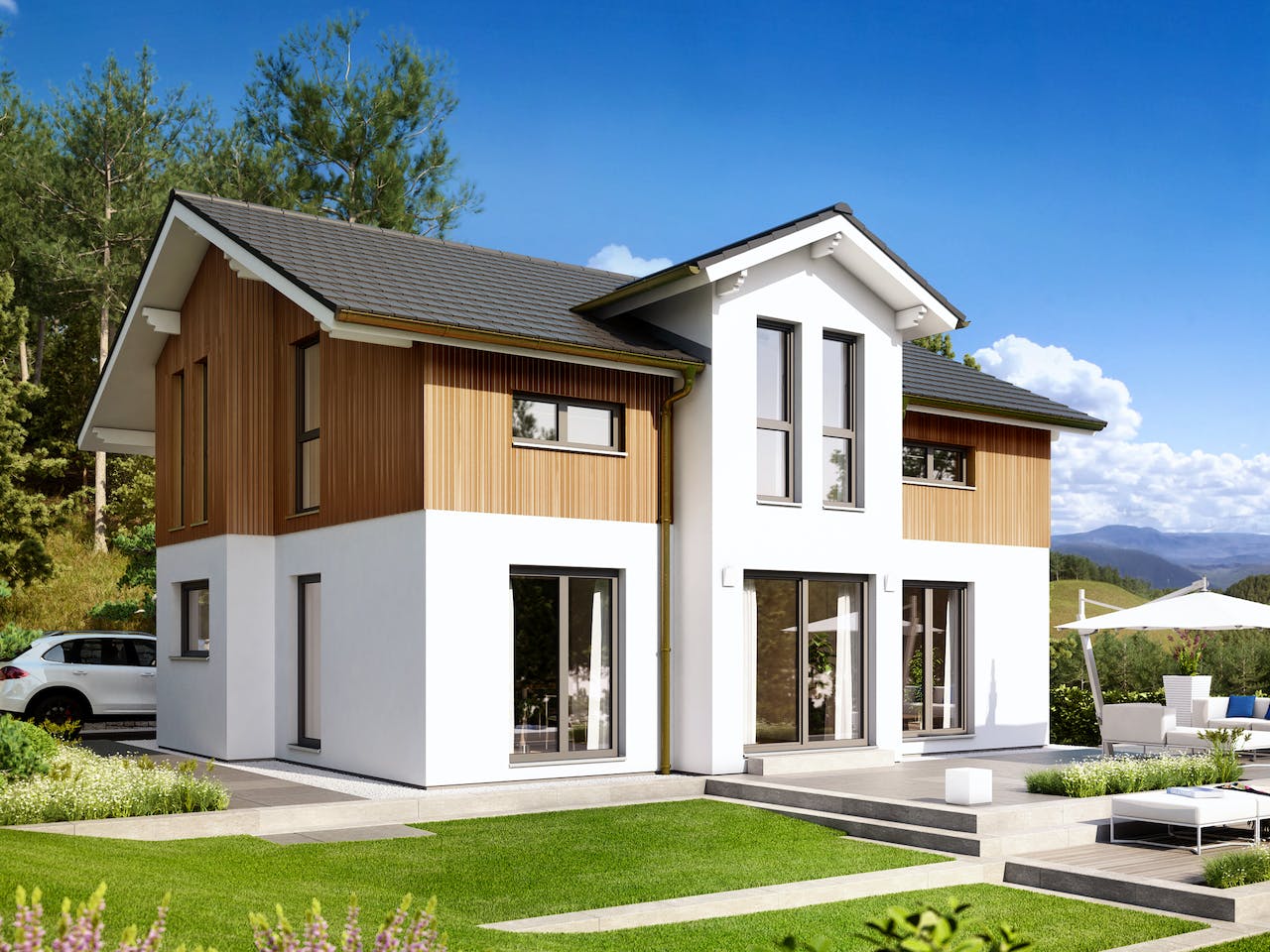 Das moderne und repräsentative EVOLUTION 152 begeistert mit Toparchitektur und vielen cleveren Detaillösungen. Varianten mit Sattel-, Walm- oder Flachdach sowie schicke und gleichzeitig praktische Architektur-Bauteile ermöglichen es Ihnen, Ihr individuelles Traumhaus zu kreieren, das perfekt zu Ihren Anforderungen und Wünschen passt. Etliche Highlights erwarten Sie auch im Inneren des Hauses. Der Grundriss mit einem groß gestalteten Erdgeschoss mitsamt Arbeitszimmer sowie einem großzügigen Obergeschoss mit zwei Kinderzimmern und Ankleide bietet ein Wohnerlebnis auf einem Toplevel.