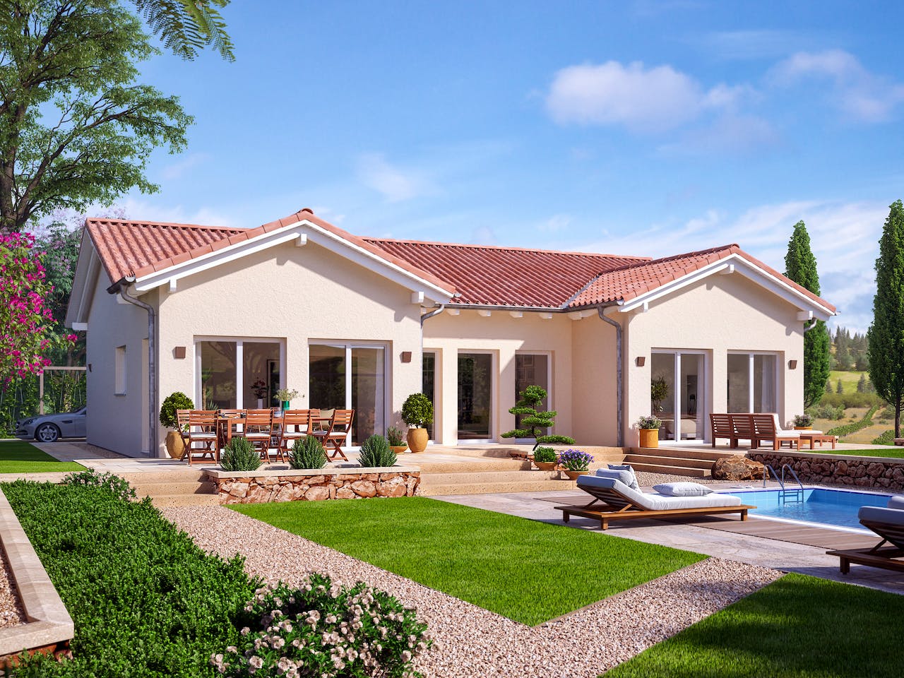 Das AMBIENCE 111 überzeugt sowohl mit seinem wohldurchdachten Grundrisskonzept als auch mit überaus ansprechender Architektur. Als vollwertiges Eigenheim für zwei bis drei Personen glänzt dieser Bungalow mit einem offenen, lichtdurchfluteten Wohnbereich, einer praktischen Diele mit Garderobe, einem zusätzlichen Arbeitszimmer sowie einem separaten Gäste- oder Kinderzimmer mit eigenem Dusch-WC. Durch tolle Erkerlösungen und diverse Architektur-Bauteile werden ganz nach Bedarf noch mehr Wohnraum und eine einladende Terrassensituationen geschaffen.