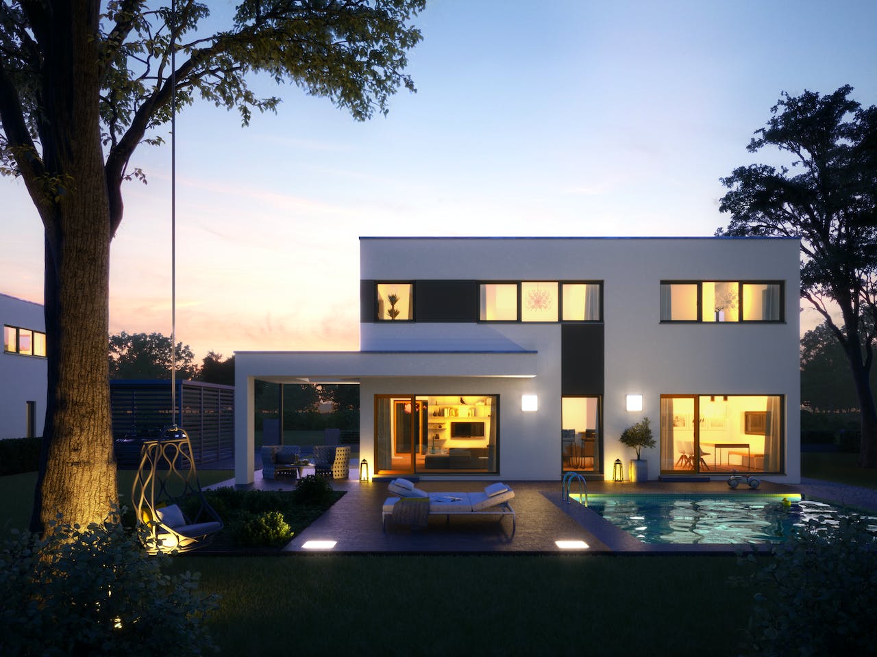 Das Gestaltungsprinzip der klaren Linien, der zurückhaltenden Materialien und harmonischen Proportionen in der Innen- und Außengestaltung beruhigt die Sinne und schafft ein entspanntes Wohnklima. Augesattet mit vielen im Preis inbegriffenen Extras wie bodengleiche Duschen, Hebe-Schiebetüren und farbige Fenster, runden den Eindruck perfekt ab.