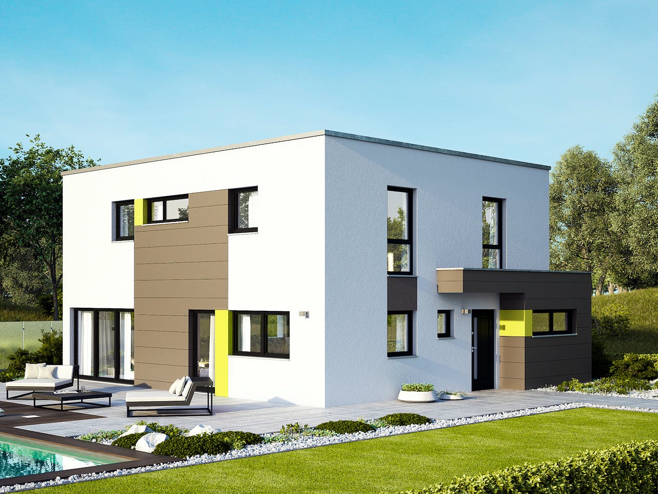 Ein Familienhaus mit viel Raum für 3 Kinder und Gäste gepaart mit moderner Architektur ergibt unser Wohnkonzept Bellissimo. Der offen gestaltete Grundriss mit offenem Wohn-/Essbereich und offener Küche sind das Markenzeichen dieses Hauses.