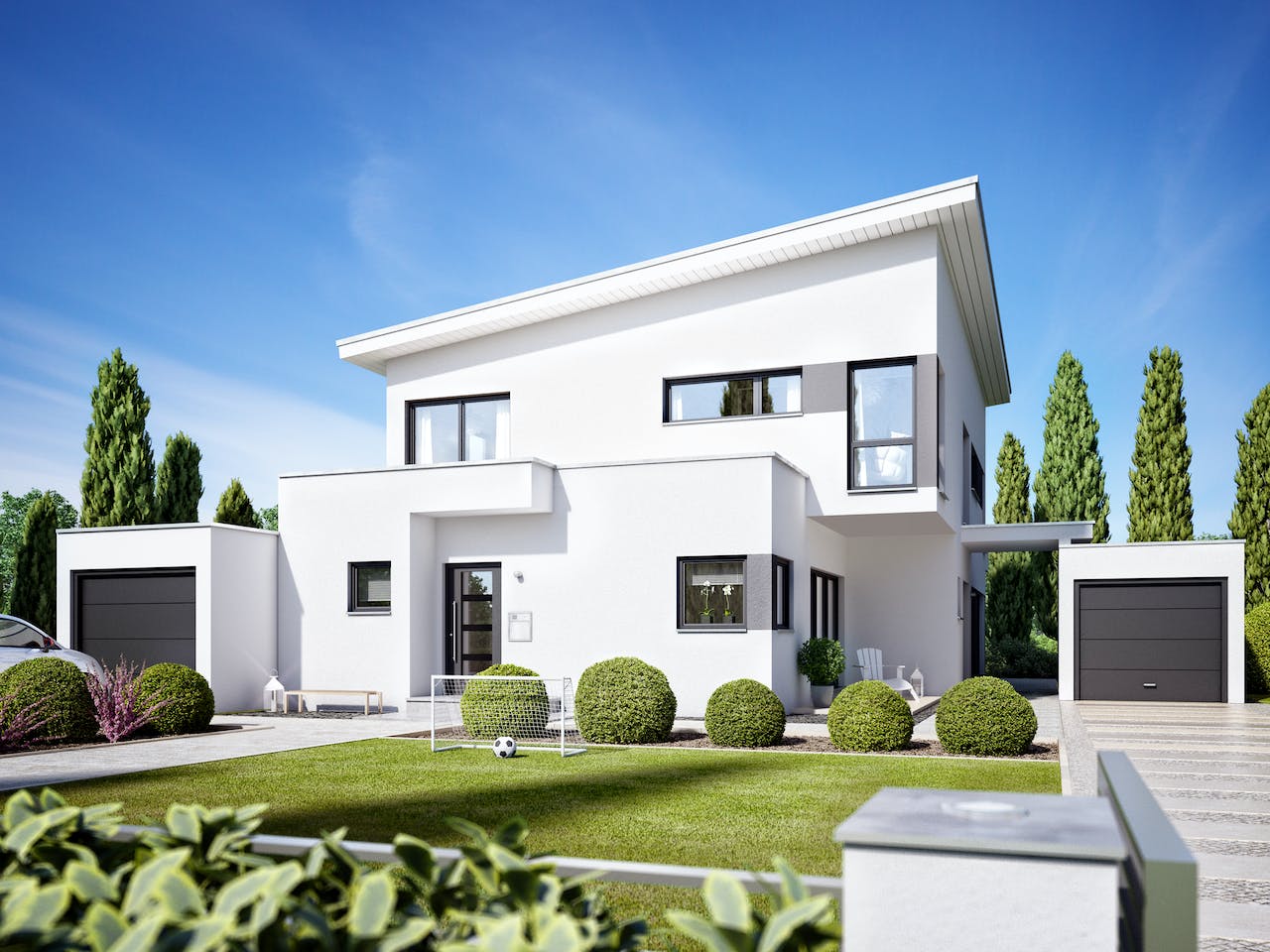 Dieses Zweifamilienhaus gibt es als Pult- oder Flachdachvariante.