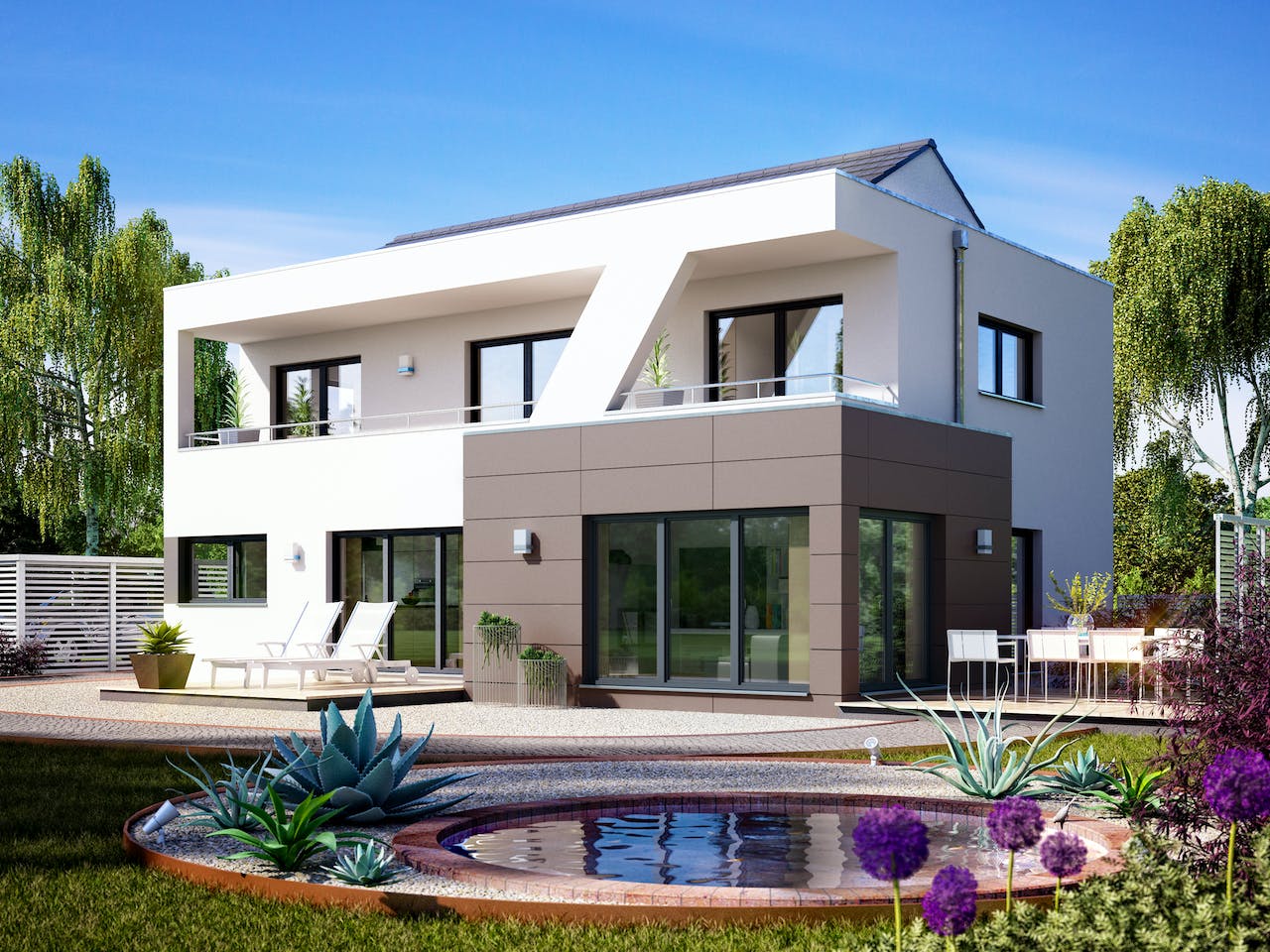 Das Architektenhaus Domingo beeindruckt durch die moderne, kubistische Architektur und die klare Formensprache. Im Erdgeschoss befindet sich die offene Wohnküche mit Kochinsel und Theke, woran sich der Essplatz und der versetzt angeordnete Wohnraum anschließt. Zentral zwischen Ess- und Wohnzimmer sorgt ein Kamin für Behaglichkeit. Zusätzlich befinden sich ein funktionales Arbeitszimmer, ein Duschbad und der Hauswirtschaftsraum auf dieser Ebene. Im Dachgeschoss erstreckt sich der Balkon über die gesamte Gebäudebreite. Von den beiden hellen Kinderzimmern und dem Elternschlafzimmer gelangt man direkt ins Freie. Viel Licht und eine außergewöhnliche Aufteilung kennzeichnen das großzügige Wellnessbad, das sich direkt neben dem Elternschlafraum befindet. Ein von der Galerie aus zu erreichendes zusätzliches Duschbad vervollständigt das Raumangebot.