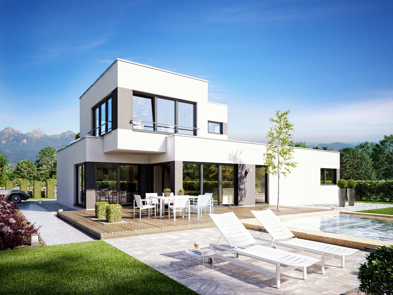 Die bewusst reduzierte Formensprache, große Fensterelemente und der Kontrast aus weiß verputzter Fassade und dunklen Fensterrahmen kennzeichnen das Architektenhaus Superio. Als größter Bereich im Haus ist die Wohnküche mit Essbereich und anschließendem Wohnzimmer offen gestaltet und damit der zentrale Raum des modernen Einfamilienhauses. Im privaten Trakt befinden sich das Schlafzimmer, die helle Ankleide und das luxuriöse Bad mit integrierter Sauna. Das Gästezimmer verfügt über ein separates Gästebad. Das penthausartige, großzügig verglaste Studio im Dachgeschoss dieses Fertighauses wird ergänzt durch die weitläufige Dachterrasse.
