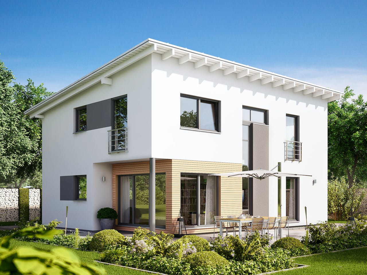 Das offen gestaltete Wohnkonzept im Erdgeschoss und die über zwei Geschosse verglaste Galerie, die ausreichend Platz für einen Arbeitsplatz bietet, sorgen für ein großzügiges Wohnambiente. Die überdachte Terrasse, das zweite Duschbad sowie ein Elternschlafzimmer mit separater Ankleide und direktem Zugang zum Bad sind weitere Highlights des Architektenhauses Trento.
