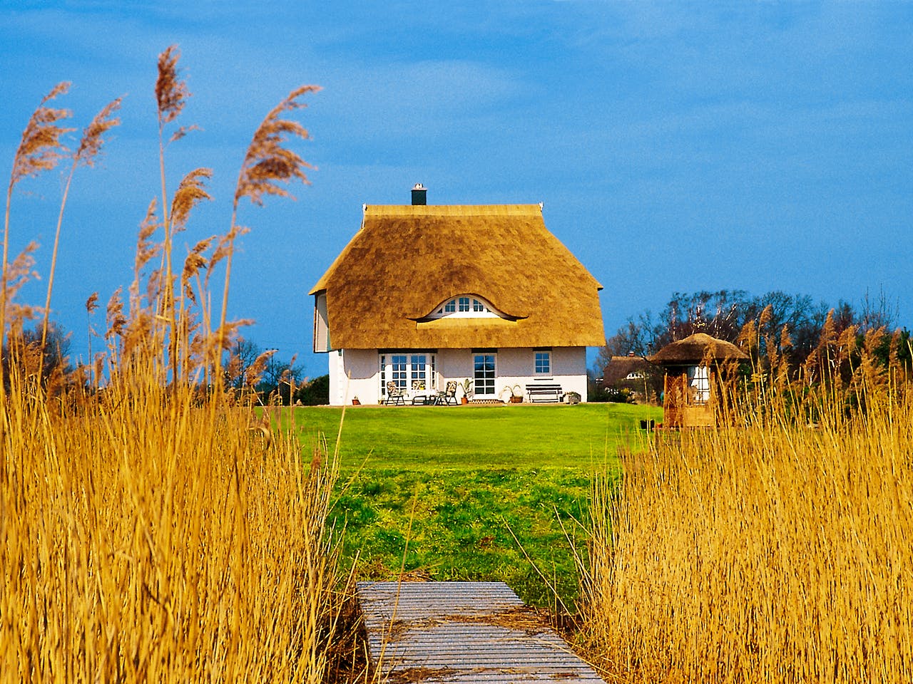 Das Landhaus Stockholm unter Reet mit einem Außenmaß von 10,30 x 9,51 Metern und einer Grundfläche von fast 147 qm (DIN 277) - davon 79,40 qm im EG und 66,80 qm im DG - bietet noch folgende interessante Hausdaten: 52° Krüppelwalmdach m. 90 cm Abseite im DG, Polar-Isolierung, Reetdach mit Fledermausgaube, Fassade: Verblendsteinmauerwerk im EG, Holzverkleidung an den Giebeln, 5-Kammer- Kunststoff-Fenster mit 3-fach-Verglasung und aufgesetzten Sprossen; Haustechnik: Gas-Brennwert-Heizung, Innenschornstein, Heizendenergieverbrauch: 46 kWh/qm a.
