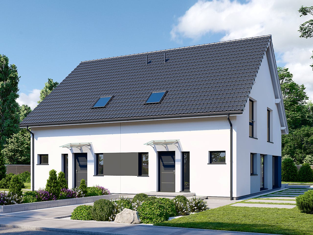 Eineinhalbgeschossige Doppelhaushälfte mit vier Zimmern, Ankleide, Küche, Bad, Gäste-WC, Technikraum, Abstellraum und Diele. Satteldach mit 40° Dachneigung, Kniestock 1,25 m. Abgeschlepptes Dach als Terrassenüberdachung.
