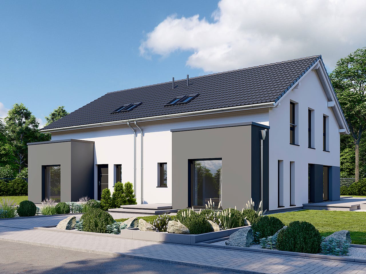 Eineinhalbgeschossige Doppelhaushälfte mit fünf Zimmern, Ankleide, Küche, Bad, Gäste-WC, Technikraum und Diele. Satteldach mit 30° Dachneigung, Kniestock 1,50 m. Vorbau mit Flachdach.
