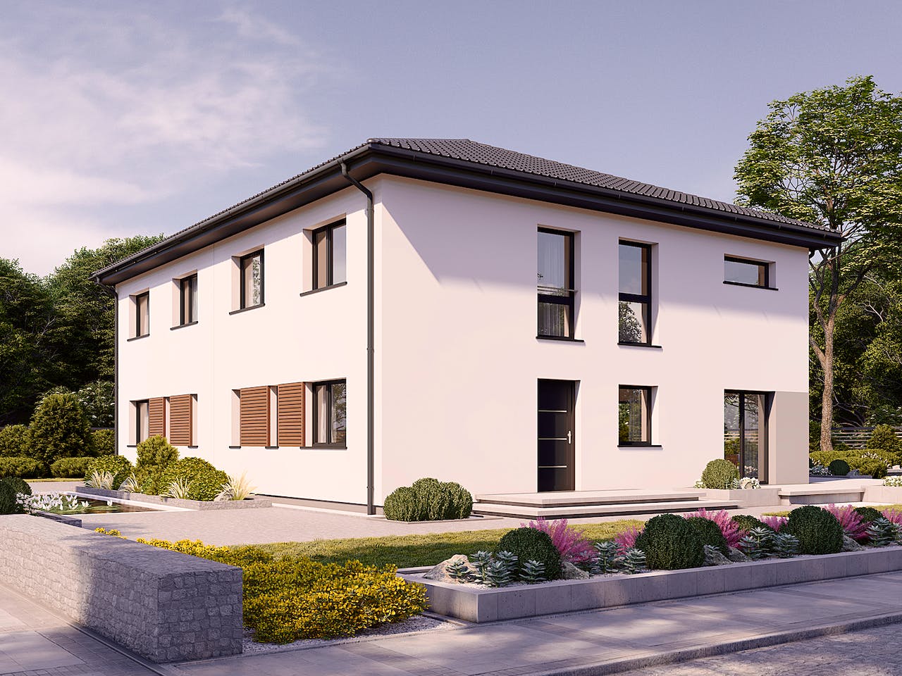 Zweigeschossige Doppelhaushälfte mit fünf Zimmern, Ankleide, Küche, Bad, Gäste-WC, Technikraum, Abstellraum und Diele. Walmdach mit 22° Dachneigung.