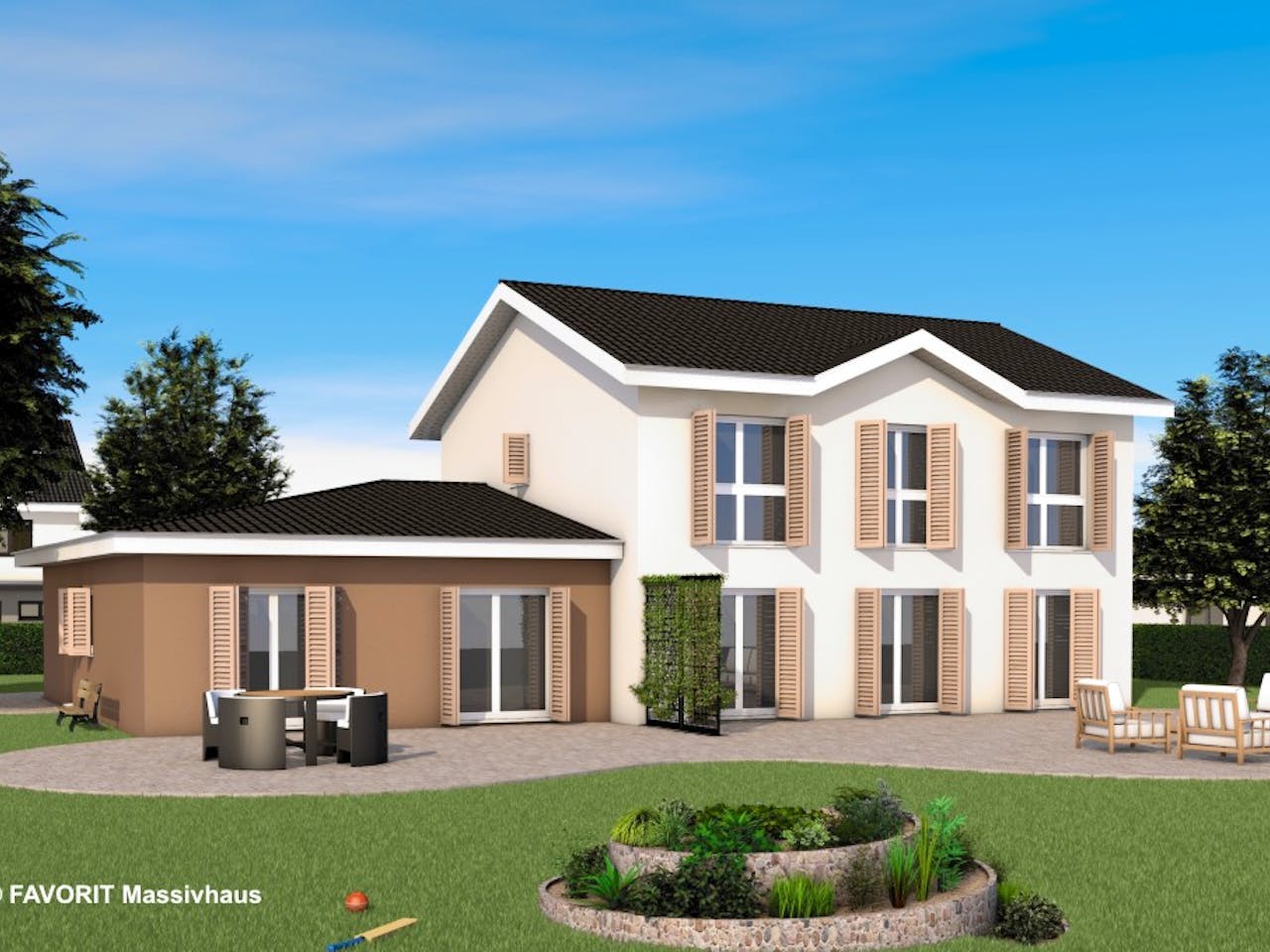 Mit dem Premium 165/71 zeigt FAVORIT Massivhaus ein Zweifamilienhaus mit deutlich voneinander getrennten und unabhängigen Raumprogrammen. Die Einliegerwohnung im eingeschossigen „Bungalow Anbau“ hat einen separaten seitlichen Zugang und ist barrierearm für zwei Personen konzipiert. Das Haupthaus verfügt neben einem überdachten Stellplatz auch über einen seitlichen Eingang sowie einen Windfang. Im Erdgeschoss bildet das offene Wohn-/Esszimmer mit direktem Übergang zur offenen Küche helle und attraktive Wohnräume. Ein Gästezimmer mit anliegendem Dusch WC und ein Hauswirtschaftraum komplettieren das Raumangebot im EG. Über die Treppe im Dielenbereich gelangt man in das Obergeschoss, welches neben zwei Kinderzimmern und dem Elternschlafzimmer (mit angeschlossener Ankleide) auch noch Platz für ein Büro mit Ausblick in den Garten sowie ein Familienbad lässt. FAVORIT bietet somit auch Zweifamilienhausideen für mehrere Generationen.