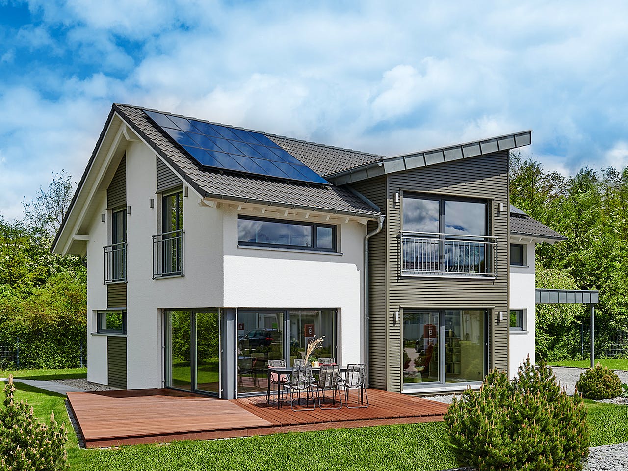 Mit seiner großzügig verglasten Terrassenseite und dem asymmetrischen Querbau mit Pultdach präsentiert sich das Plusenergiehaus elegant und sonnendurchflutet. Ein überdachter Eingangsbereich und die Kombination aus Putz- und Holzfassade lassen das WEISS-Musterhaus in einer zeitgemäßen Optik erscheinen. Großzügigkeit pur im Erdgeschoss, Platz und Raum für bis zu drei Kinderzimmer im Dachgeschoss. Und die Haustechnik ist wie gewohnt vom Feinsten!