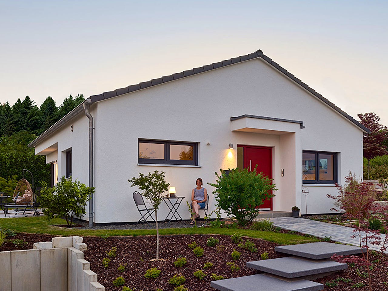 Perfekt für Singles und Paare: Der Bungalow mit Satteldach schafft ein helles, ebenerdiges Zuhause für bis zu drei Personen. Die L-förmige Eingangsüberdachung und der Gebäuderücksprung an der Terrasse lockern den geradlinigen Hausentwurf auf und schaffen gleichzeitig wettergeschützte Zugänge zum Haus. Auf einer Ebene wurden ein geräumiger Wohn- und Essbereich mit Küche, der Schlaftrakt mit Badezimmer sowie ein Arbeits- oder Gästezimmer und ein Haustechnikraum untergebracht. Zusätzlichen Stauraum bietet der Spitzboden.