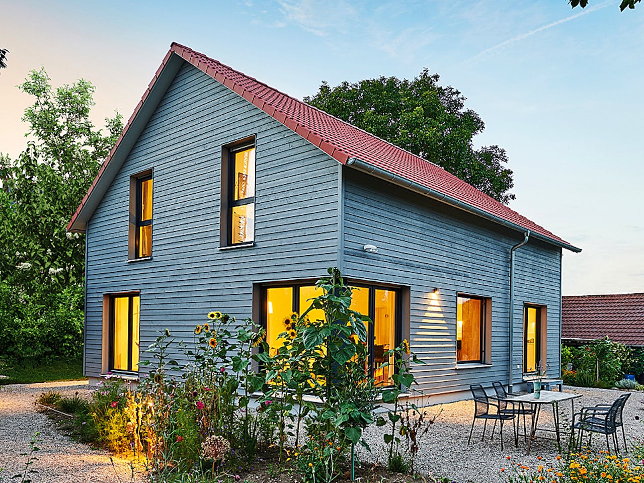 Dieses Haus mit Satteldach zeigt, wie attraktiv moderner, ökologischer Holzfertigbau sein kann: Die hochgedämmte Konstruktion sorgt im Zusammenspiel mit dreifachverglasten Fenstern und sparsamer Haustechnik für effizienten Betrieb. Im Dachgeschoss finden neben dem Familienbad vier weitere Zimmer Platz. Ein zusätzliches Zimmer im Erdgeschoss kann als Arbeitszimmer genutzt werden und ermöglicht im höheren Alter zusammen mit dem Duschbad das Wohnen auf einer Ebene.
