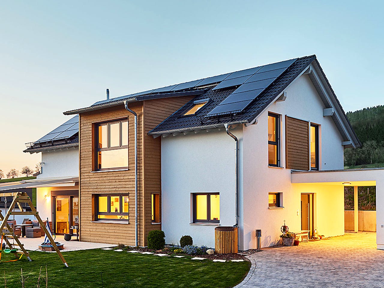 Viel Platz für Familien: Der individuell geplante Hausentwurf von Fertighaus WEISS wurde mit zusätzlichem Carport und Garage ausgeführt und erhält durch den holzverschalten Querbau eine großzügige Optik. Während im Erdgeschoss zusätzlich zu Wohn-, Koch- und Essbereich ein Arbeits-/Gästezimmer sowie ein zusätzliches Duschbad eingeplant wurden, befinden sich im Dachgeschoss zwei große Kinderzimmer, das Elternschlafzimmer, das Familienbad und eine helle Galerie. Dank des Kniestocks von 160 Zentimetern sind die Räume trotz der Dachschrägen gut möblierbar.