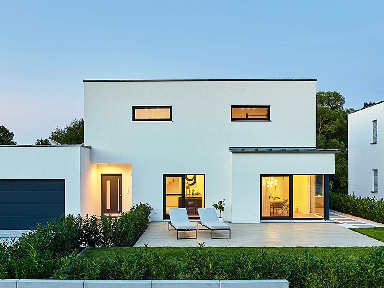 Bauhaus im besten Sinne: Der kubische weiße Baukörper des Hausentwurfs Rohr wird durch eine Garage, zwei Raumerweiterungen und eine Dachterrasse ergänzt. Außen bilden die anthrazitgrauen Akzente einen schönen Kontrast zur weißen Putzfassade. Im Erdgeschoss wurde ein großer Wohn-, Ess- und Kochbereich als Zentrum des Hauses geplant. Ergänzt wird dieser durch ein Arbeitszimmer, ein Duschbad und den Technikraum. Im Obergeschoss sind die großzügigen Individualräume der vierköpfigen Familie und das Familienbad untergebracht.