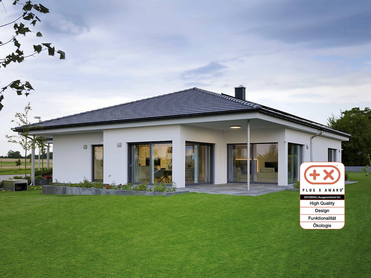 Von außen betrachtet ist Haus VITA ein traditioneller Winkelbungalow mit Walmdach, der durch sparsam eingesetzte Stilelemente behutsam an den Zeitgeschmack herangeführt wurde. Letzteres betrifft vor allem schlanke, stehende Lichtbänder, die hervorragend mit dem eleganten Erscheinungsbild des Musterhauses harmonieren. Diese Eleganz verdankt es in erster Linie seinem Farbkonzept: Die graue Dacheindeckung unterstreicht hervorragend die repräsentative Ausstrahlung der weißen Putzfassade, in der trotz einigen Vor- und Rücksprüngen eine klare Linienführung stilprägend ist.