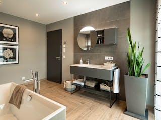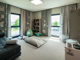 Die Wohnfläche mit rund 188 Quadratmetern eignet sich perfekt für eine Familie mit zwei Kindern oder – wie im Musterhaus in Gießen gezeigt – für eine Familie mit Bedarf für zusätzliche Gewerbe- und Arbeitsräume.