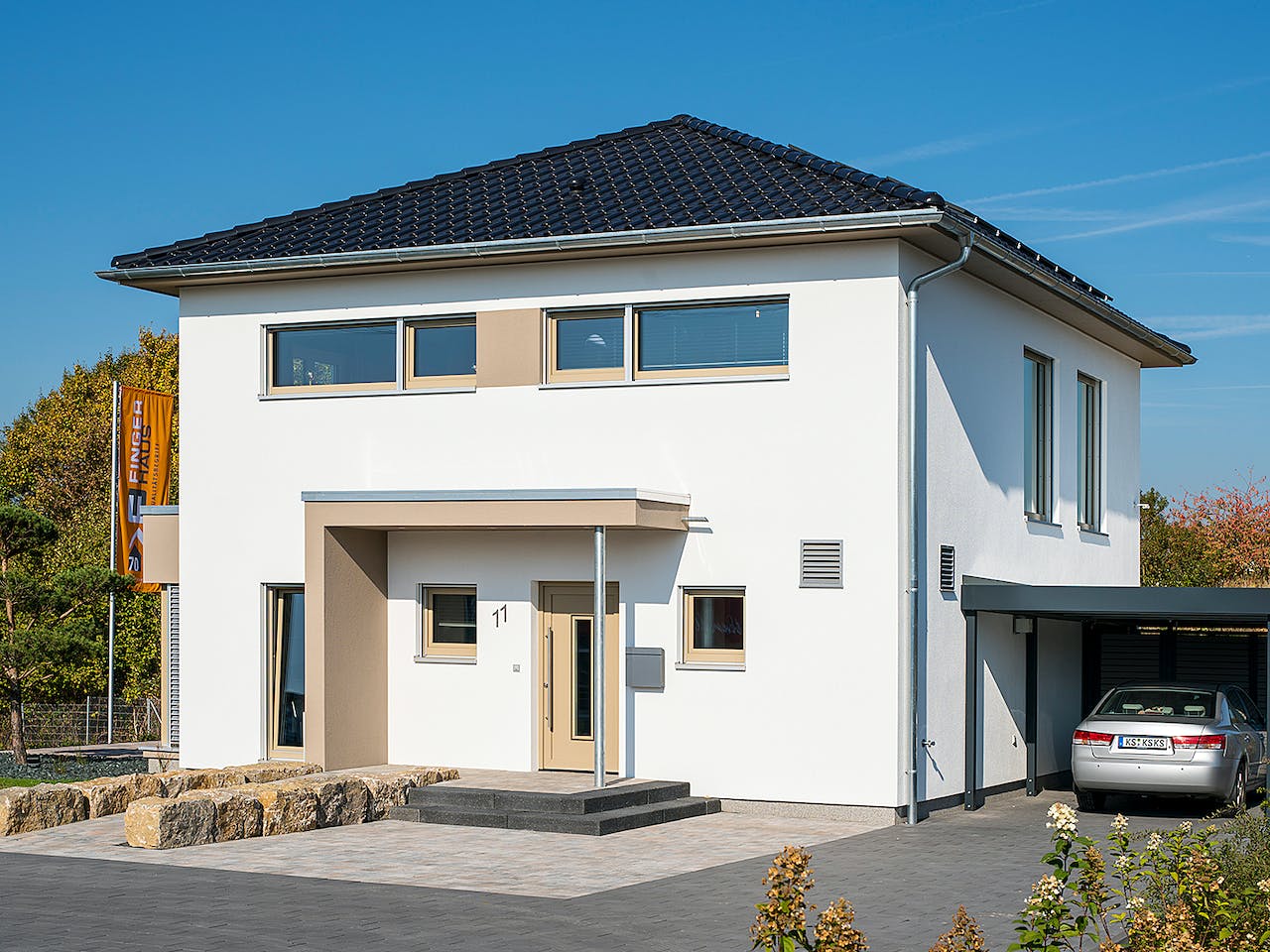 Ein gut geschnittenes Familienhaus mit viel Platz für Kind und Kegel – dafür steht die Stadtvilla MEDLEY 3.0 300 B. Der Grundriss mit seinen etwa 160 Quadratmetern Wohnfläche und das beschützend wirkende Walmdach lassen das neue Haus besonders kompakt und modern erscheinen. Dazu tragen auch die Fassadengestaltung mit farbigen Putzstreifen, ein Rechteckerker und das Haustürvordach bei. Besonders praktisch: ein zusätzlicher Raum im Erdgeschoss, der im Musterhaus als Büro ausgeführt wurde. Ein Traum ist die Ankleide neben dem Schlafzimmer. Wie alle Finger-Häuser ist auch das MEDLEY 3.0 300 B auf dem neusten Stand der Technik. Als förderfähiges KfW-Effizienzhaus 40 EE erfüllt es überdies höchste Ansprüche an den Energiestandard.