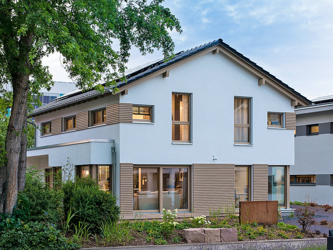 Das MEDLEY 3.0 des hessischen Fertighausherstellers FingerHaus präsentiert sich hier mit einer Wechselfassade aus weißem Putz und grauer Holzverschalung. Der besondere Clou des Musterhauses ist die flache Dachneigung des klassischen Satteldaches: Das ermöglicht einen Kniestock von 2,15 Metern – und damit Stellflächen im Dachgeschoss, die an ein Stadthaus mit zwei Vollgeschossen erinnern. Als KfW-Effizienzhaus 40 Plus erfüllt es überdies den höchsten aktuellen Energieeffizienz-Standard.