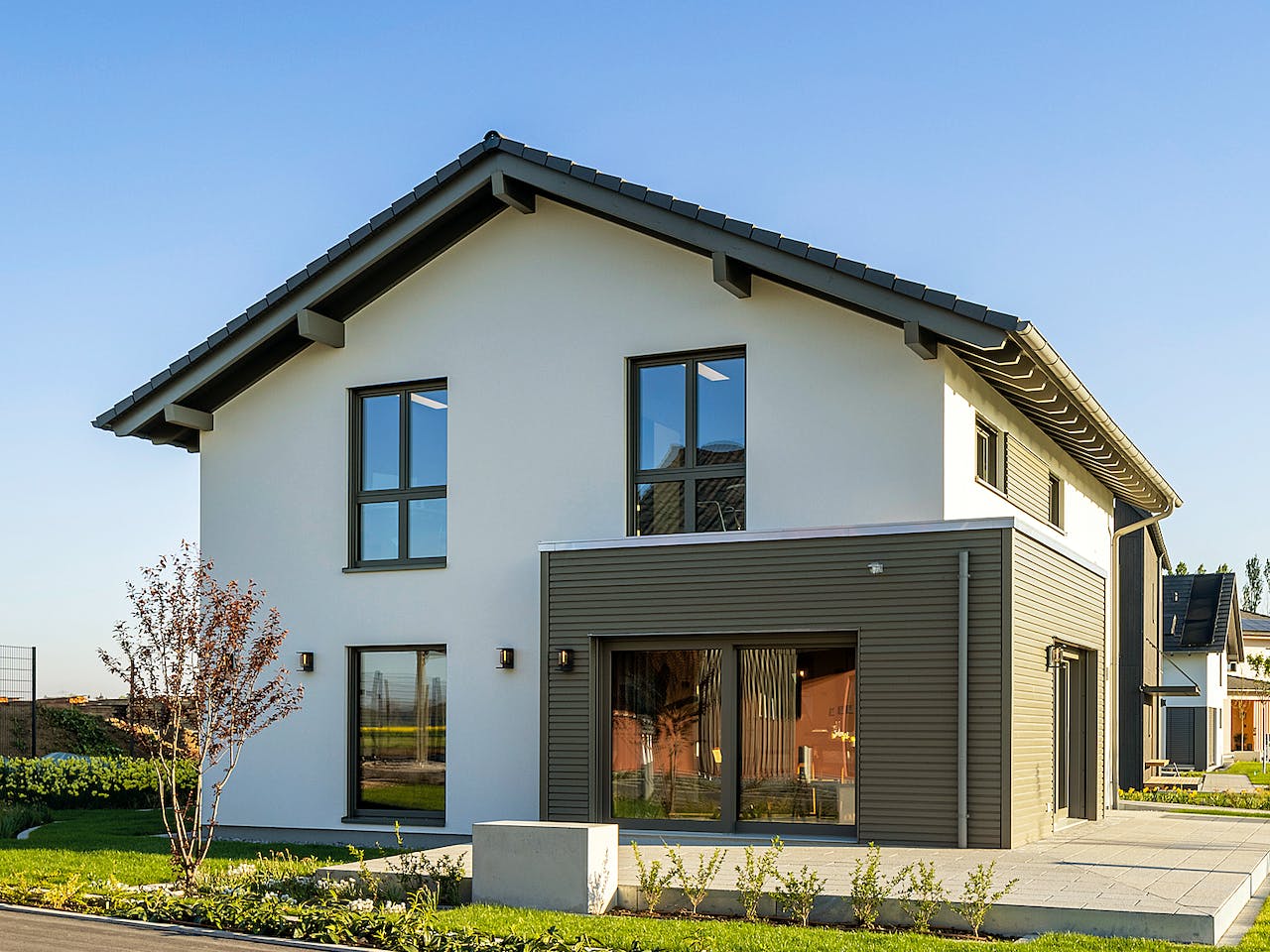 Das ARTIS 400 in der FertighausWelt Schwarzwald hat FingerHaus mit einem klassischen Satteldach, 25 Grad Dachneigung und 2,15 Meter hohem Kniestock gebaut. Der Rohstoff Holz spielt nicht nur bei der Konstruktion des ARTIS eine große Rolle, sondern auch bei vielen Fassadendetails. Ein großer Flachdacherker erweitert den Wohnraum. Auf der Terrassenseite besitzt das Finger-Haus sowohl im Erd- als auch im Dachgeschoss bodentiefe Fenster.