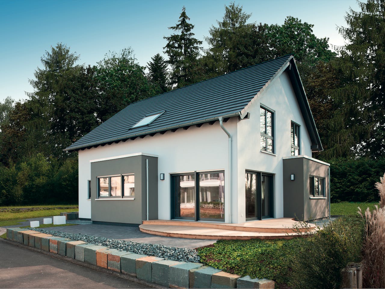 Die Form des Musterhauses "Neo 312" in Bad Vilbel ist kompakt und gut geeignet auch für kleinere Grundstücke. Innen überzeugt sofort die Großzügigkeit - 74 m² Fläche für Eingangsbereich, Kochen und Essen sowie Wohnzimmer, die offen ineinander übergehen. Im Dachgeschoss erwartet einen dann das Elternschlafzimmer mit direktem Zugang zum fast 13 m² großem Wellness-Bad und die zwei Kinderzimmer, ergänzt um ein Duschbad.