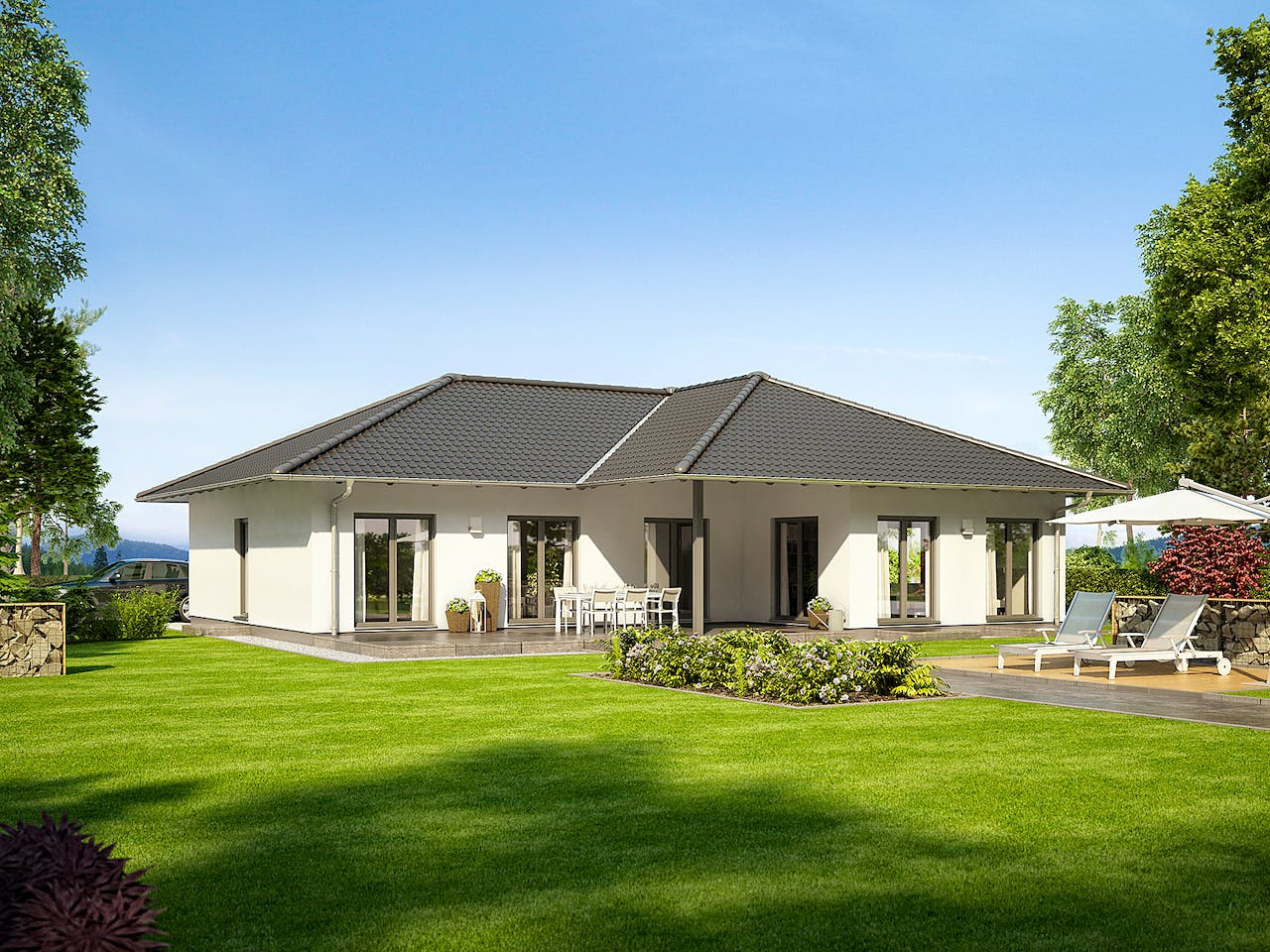 Mit Fertighaus NIVO präsentieren wir Ihnen ein Bungalowkonzept, das mehr kann. Alle Fertighaus NIVO-Entwürfe können Sie mit klassischem Walmdach oder mit Flachdach erhalten, was den Charakter der Architektur bei gleichem Grundriss grundlegend ändert. Mit raffinierten Sonderbauteilen können Sie Ihren persönlichen Traumbungalow noch individueller gestalten. Ihr Geschmack entscheidet. Natürlich bieten wir alle Entwürfe entweder mit Finger-Keller oder auf THERMO+ Fundamentplatte an.