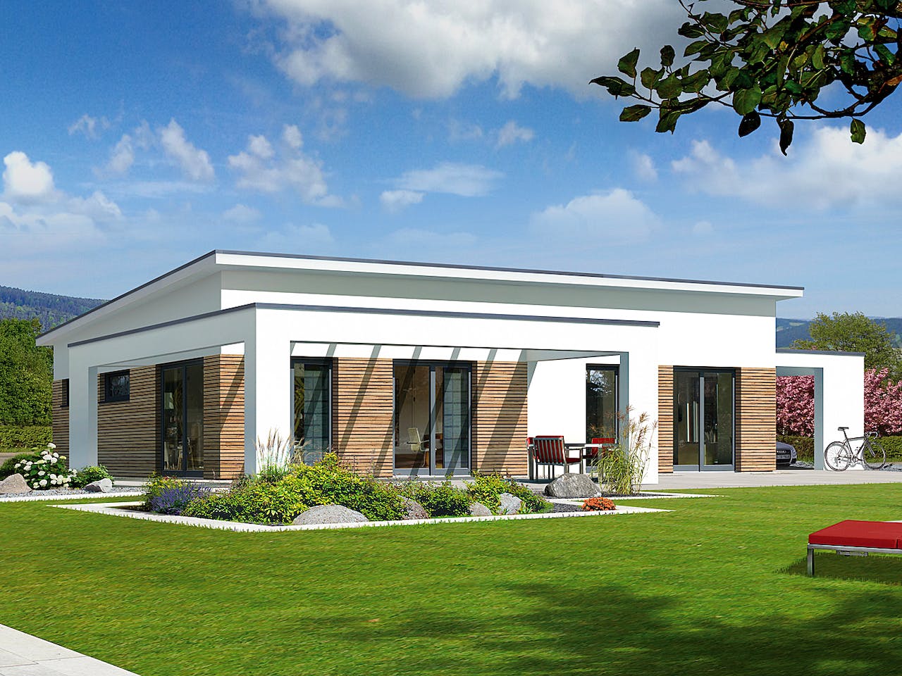 Der geradlinige Bungalow ermöglicht modernes und praktisches Wohnen auf einer Ebene. Der durchdachte Grundriss und die moderne Architektur sorgen für ein gelungenes Gesamtpaket. Vom Eingangsbereich des Hauses aus, gelangen Bewohner und Besucher in den großen Wohn- und Essbereich mit integrierter Küche. Die großzügige Terrasse lädt zu einem Barbecue oder Sonnenbad an warmen Tagen ein. Vom Flur aus sind der Schlafbereich mit anschließender Ankleide und einem große Badezimmer zu erreichen. Ein zusätzlicher Raum kann beispielsweise als Arbeitszimmer, Hobbyraum oder Kinderzimmer genutzt werden. Die Terrasse ist vom Wohn- und Essbereich durch große Fenstertüren aus zu erreichen und rundet das Gesamtbild des Hauses perfekt ab.