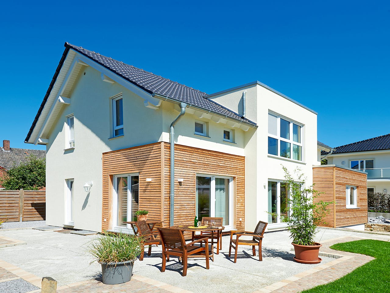 Nachhaltiges Wohnen und zukunftsorientiertes Bauen: vereint in einem gemütlichen Zuhause. Unser Haus Solaris vereint diese Aspekte unter einem Dach. Die Kombination aus Flach- und Satteldach sorgt für den individuellen Look des Hauses. Die thermische Gebäudehülle bietet perfekten Schutz vor Witterung, wobei das Raumklima im Inneren auf bestmöglichem Niveau erhalten bleiben kann.