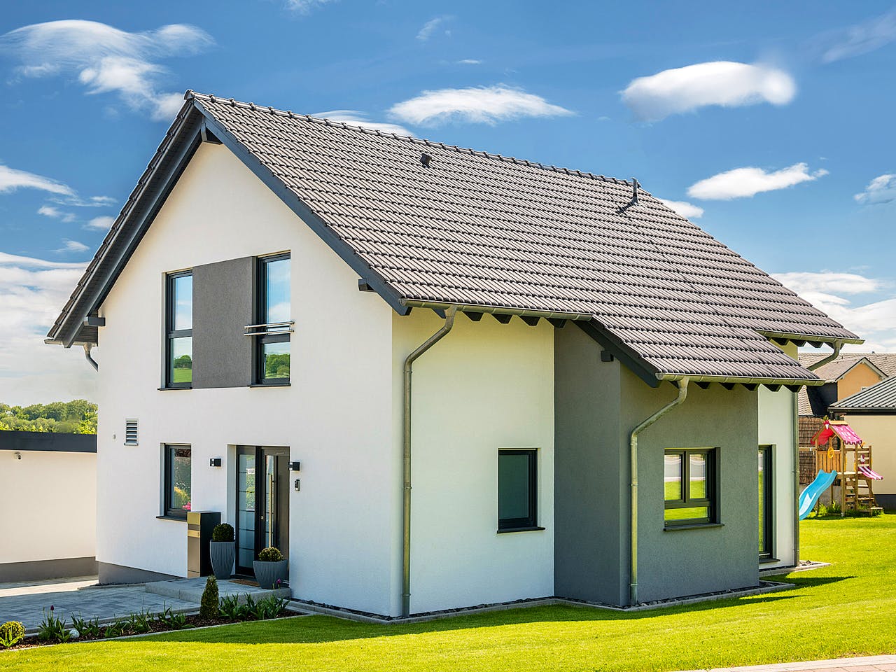 Jetzt auf Gesundheit bauen – morgen gut durchatmen: das raffinierte Satteldachhaus mit flexibel gestaltbarem Grundriss auf 140 m2 und drittem Giebel steht in seiner vollen Pracht für modernes gesundes Wohnen. Es verkörpert Wohlfühlen von innen nach außen: Neben seinem großzügigen, hellen Wohnbereich und Dachgeschossgemütlichkeit gewinnt das Haus die Herzen der Bewohner durch sein natürliches Raumklima. Und das wird erzeugt durch die Gebäudehülle ThermLiving. Dieses System ist weit mehr als eine Hülle: das Holzweichfaser-Wärmeverbundsystem auf Basis natürlicher Rohstoffe unterstützt behagliches, gesundes Leben … heute und in Zukunft.