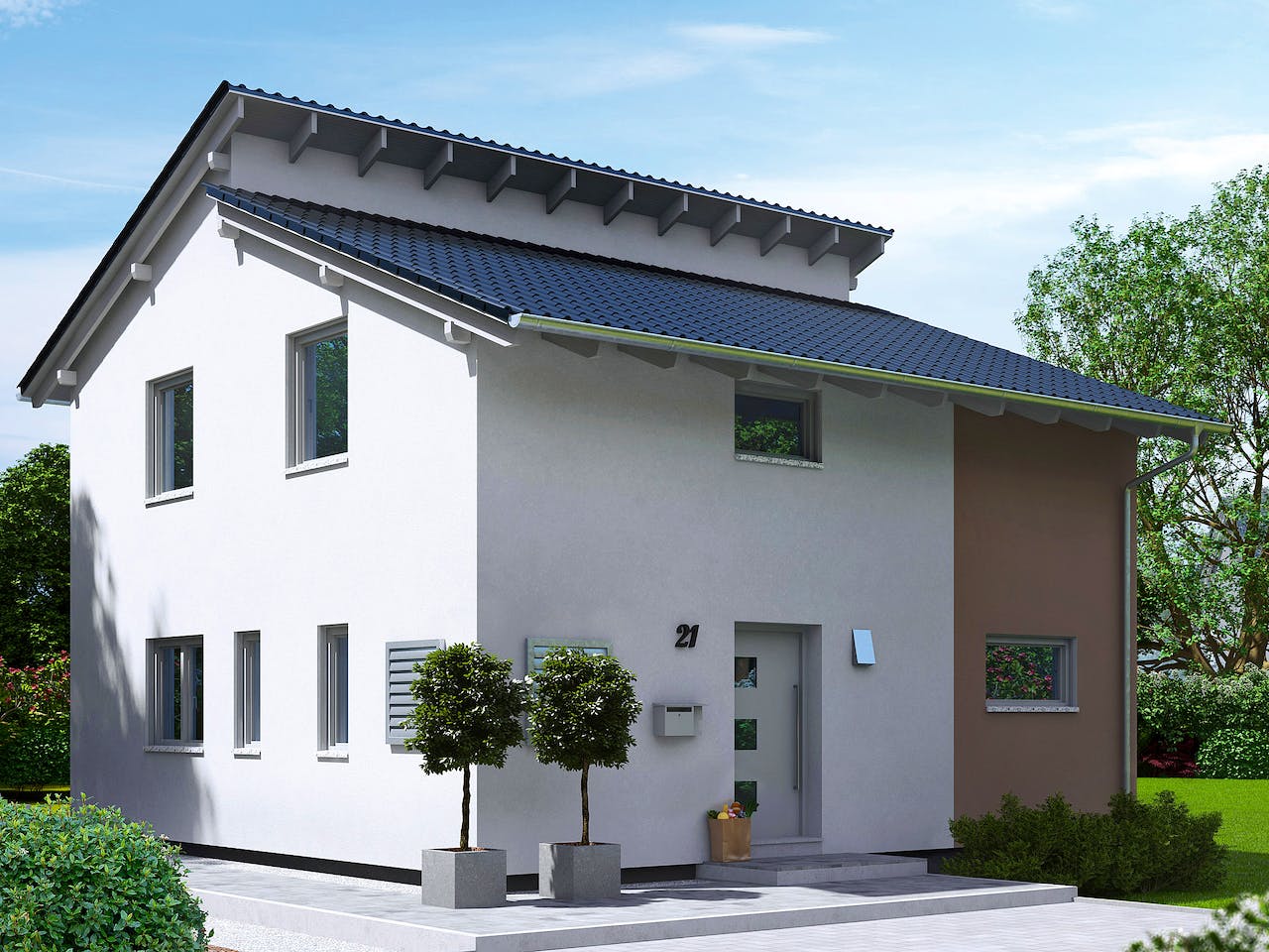 Individuelle Anbauten und die moderne Holzverschalung zieren das Flachdachhaus. Die Garage und der zurückgesetzte, überdachte Eingangsbereich geben dem Haus einen extravaganten Look.