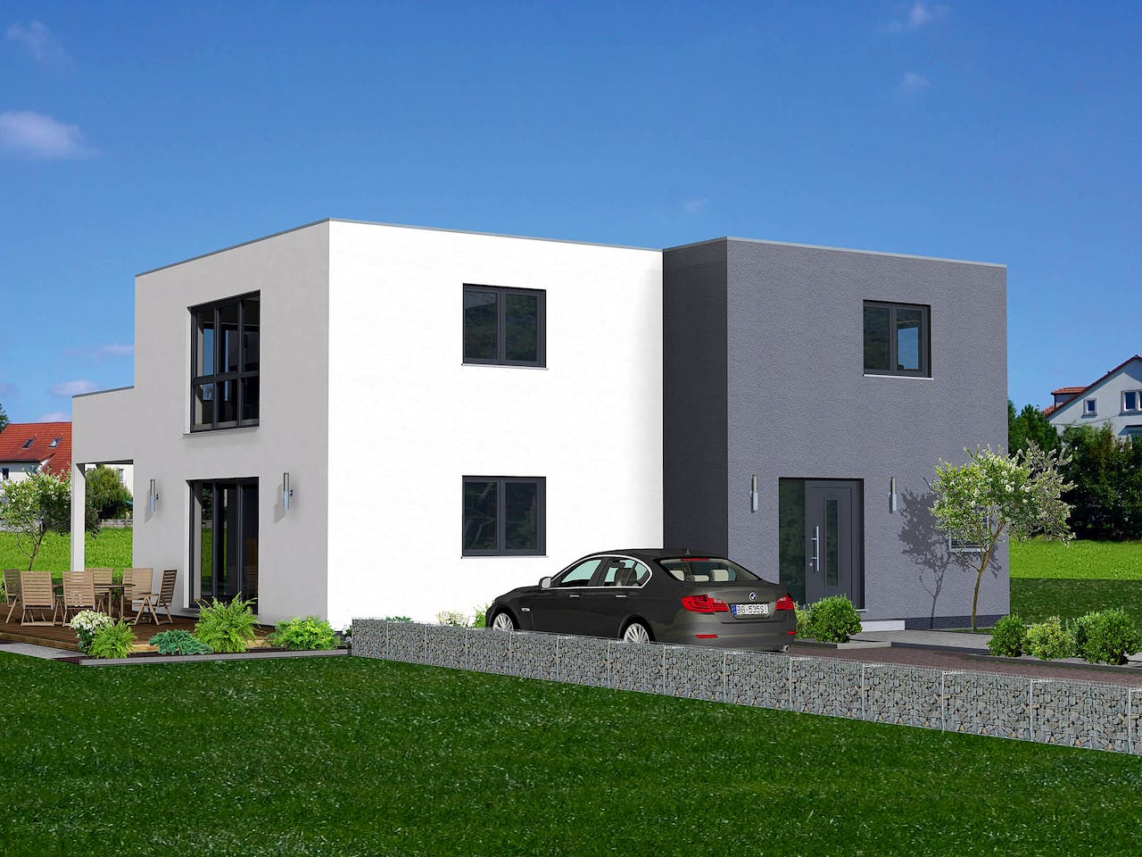 Das Bauhaus Junto verbindet klare Formen und hohen Wohnkomfort. Die beiden Wohnungen sind auf die beiden Geschosse verteilt. Die Erdgeschosswohnung verfügt über einen großen Wohn-, Koch- und Essbereich, sowie ein Schlafzimmer mit anschließender Ankleide. Außerdem sind hier ein großes Badezimmer, eine Abstellkammer und einen Hauswirtschaftsraum. Im Dachgeschoss ist die Raumaufteilung ähnlich. Hier jedoch ist ein zusätzliches Zimmer, beispielsweise für ein Kinderzimmer eingeplant