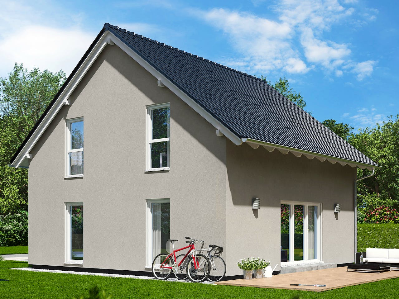 Tolles Design und pure Gemütlichkeit. Auszeichnend für komfortables Wohnen ist der große Wohn-, Koch- und Essbereich. Modern und weitläufig wirkt die offene Gestaltung des Raumes, was durch die Fenstertüren verstärkt wird. Im Dachgeschoss ist genug Platz für 2 Kinderzimmer und ein Schlafzimmer. Außerdem ist hier ein großes Badezimmer eingeplant. Besonders für kleinere Grundstücke ist dieses Hauskonzept wie gemacht.