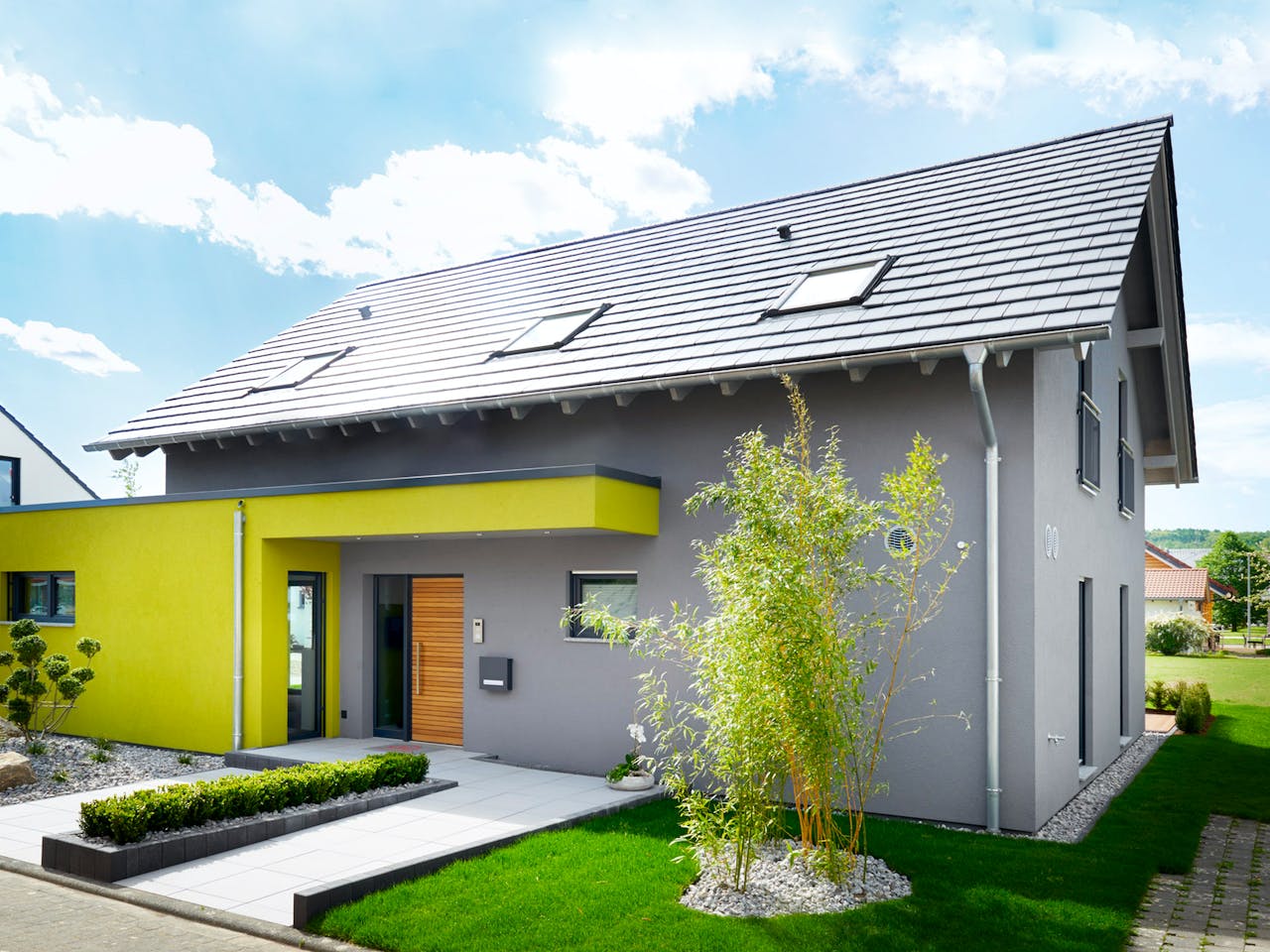 Unser Musterhaus Koblenz - variabel gestaltbar, offen, puristisch und dennoch traditionell. Das Exterieur des Satteldachhauses wirkt durch den farblich abgesetzten Kubus-Anbau modern und extravagant. Dies spiegelt sich auch im Inneren des Hauses wieder. Im Erdgeschoss befindet sich neben einem großen Büro, dem Hauswirtschaftsraum und einem Gäste-WC der Wohn- und Essbereich. Der zusätzliche Raum des Flachdachanbaus kann beispielsweise als zusätzliches Kinderzimmer oder separater Bürobereich genutzt werden. Die freitragende Eingangsüberdachung, die als Flachdachverlängerung aus dem Kubus entspringt, bildet das einladende Entree. Die Besonderheit des Grundrisses ist der Luftraum zwischen Wohn- und Esszimmer, wodurch Gäste durch ein hell gestaltetes Raumprogramm empfangen werden. Die Podest-Treppe separiert Wohn- und Essbereich geschickt.