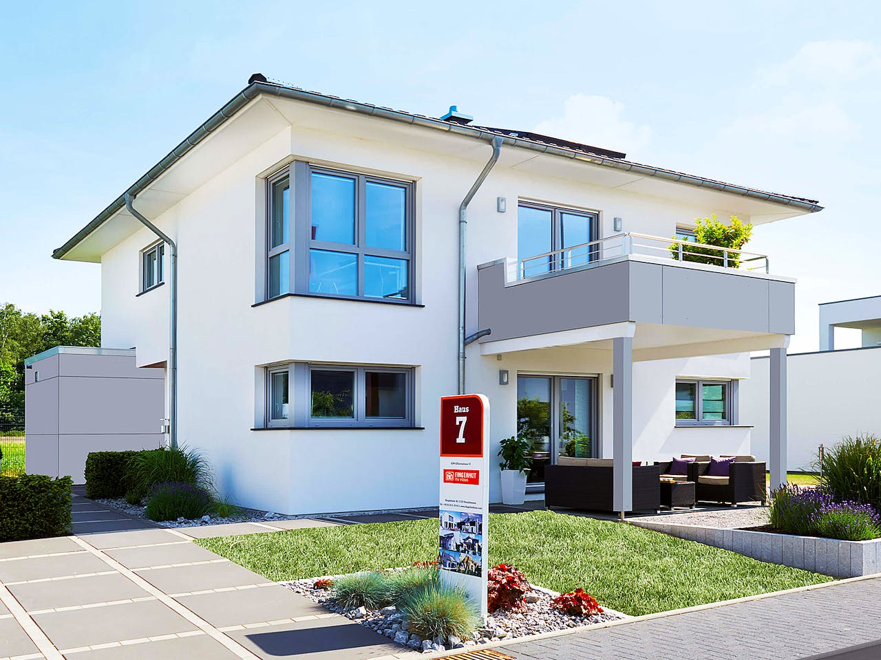 Die gezeigten Abbildungen zeigen zum Teil Sonderleistungen gegen Mehrpreis. Preis der entsprechenden Ausbaustufe inkl. Fingerhut-Bodenplatte und 19 % MwSt. gemäß der Fingerhut-Bau- und Leistungsbeschreibung 1012, Preisliste P05/25.