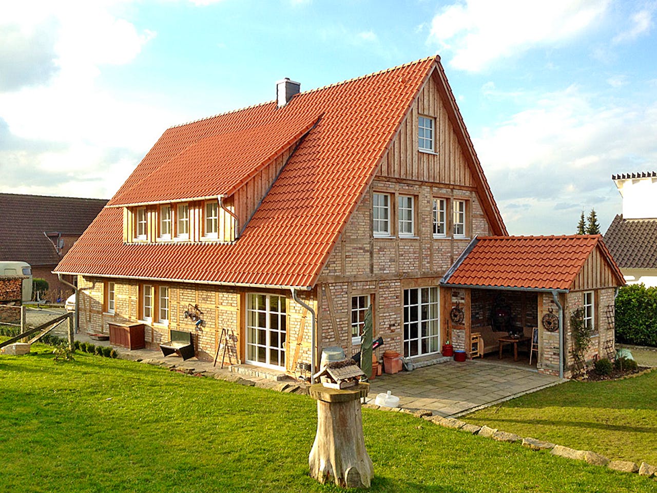Durch dieses “Gestaltungselement” erhält die “einfache” Form des Hauses einen optischen Ankerpunkt, der hervorragend mit den Proportionen des Hauses harmoniert. Schön sind auch die vielen kleinen Details im Fachwerk, die auch dieses Haus zu einem wahren Einzelstück machen.
