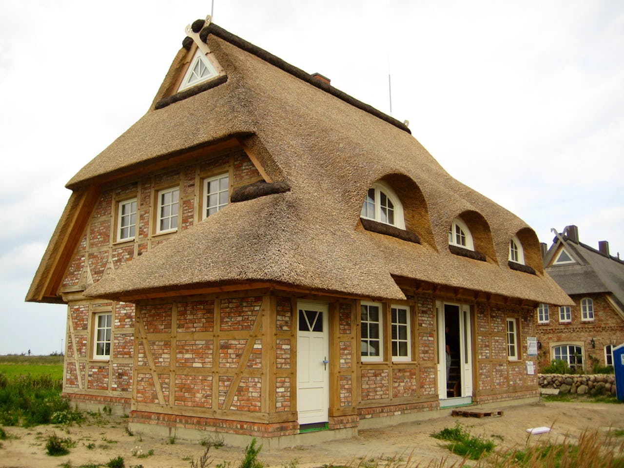 Das mit Reet gedeckte Fachwerkhaus an der Ostseeküste bietet offenes Wohnen bis in die Firstspitze. Schon im Eingangsbereich blickt man durch die offene Decke auf die Galerie des Obergeschosses.