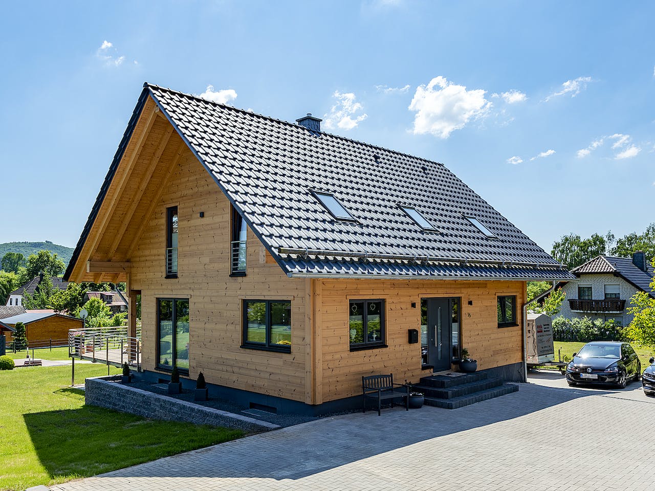 „Zwar wollten wir ein Holzhaus, aber trotzdem nicht ausschließlich Holzwände. Deshalb haben wir uns für weiß verputzte Trennwände entschieden und viele große Glasflächen nach außen eingebaut.“, erklärt die Hausherrin. So ist es drinnen sehr behaglich sowie auch schön hell. Durch die Fenster dringt reichlich natürliches Licht ein, das naturhelle Kiefernholz der Sichtbalkendecken verstrahlt optische Wärme und die Fußböden sind überall – außer in den Bädern – mit aufgehellten Eichendielen verkleidet. „Unser Boden ist immer fußwarm, auch wenn die Fußbodenheizung aus ist, und so hell, wie wir es mögen.“, freut sich der Hausherr. Angenehm ist das auch für die beiden Töchter: wenn sie spielend auf dem Boden sitzen, umherkrabbeln und durch die Räume tapsen kommt keine Kälte von unten. Die klassische aber schnörkellose Architektur von Holzhaus „Köterbergblick“, seine glatten, schlichten Holzwände, die moderne Einrichtung mit viel hellem Holz, viel weiß und etwas grau und schwarz ergeben ein stimmiges und leichtes Bild, ohne Einengung oder Druck, dafür umso mehr Behaglichkeit.