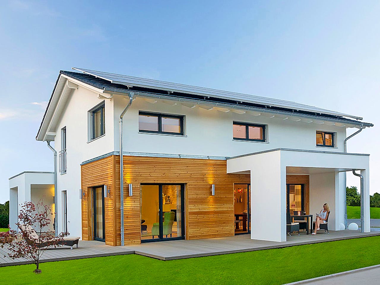 • Mit einer Photovoltaikanlage erzeugt das Fertighaus mehr Strom, als seine Bewohner benötigen.