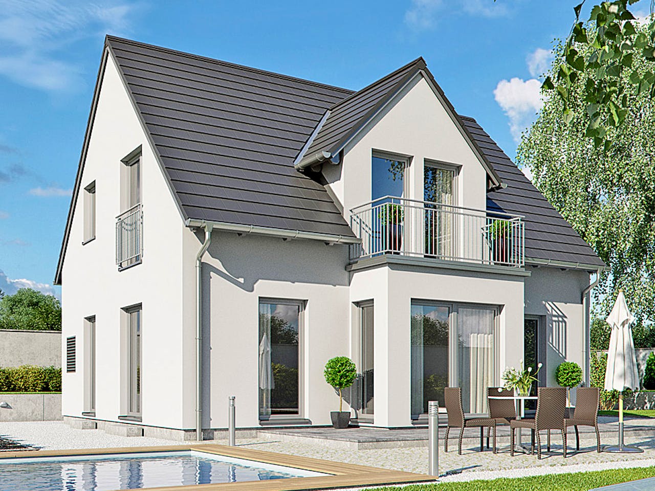 Sie suchen ein klassisches Einfamilienhaus für Ihr Grundstück in der Stadt? Ihr Traumhaus soll zum einen viel Platz für Ihre Familie zum anderen aber auch Raum für einen Garten lassen? Dann lohnt sich ein Blick auf Haas S 130 C. Die hier vorgestellte Variante des Fertighauses mit steilem Satteldach, Erker und Quergiebel wurde speziell für das Bauen in der Stadt entwickelt. Durch den kompakten Grundriss von gut 9 m auf 8 m passt das Haus auch auf kleinere Grundstücke. Seine Raumaufteilung ist so gestaltet, dass alles, was eine vierköpfige Familie benötigt, untergebracht ist und sogar der Technikraum findet im Erdgeschoss noch Platz. So sparen Sie die Kosten für einen Keller.