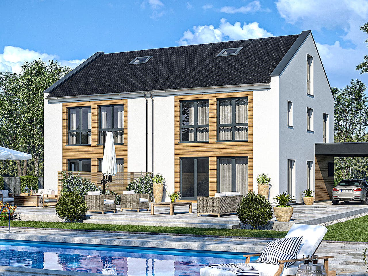Beim Bau eines Doppelhauses geht es meist darum, den vorhandenen Raum clever auszunutzen. Das Haas D 128 B zeigt gekonnt, wie das geht. Dadurch dass das Dach des Hauses ausgebaut ist, findet dort ein Studio mit eigenem kleinem Bad mit Dusche Platz. Im Obergeschoss befinden sich drei weitere Schlafzimmer und das relativ großzügige Familienbad. Im Erdgeschoss bilden Küche, Wohn- und Essbereich eine große Einheit. Durch die bodentiefen und großzügig bemessenen Fenster auf der Traufseite fließt viel Sonnenlicht in die Räume. Das schafft eine angenehme Atmosphäre.