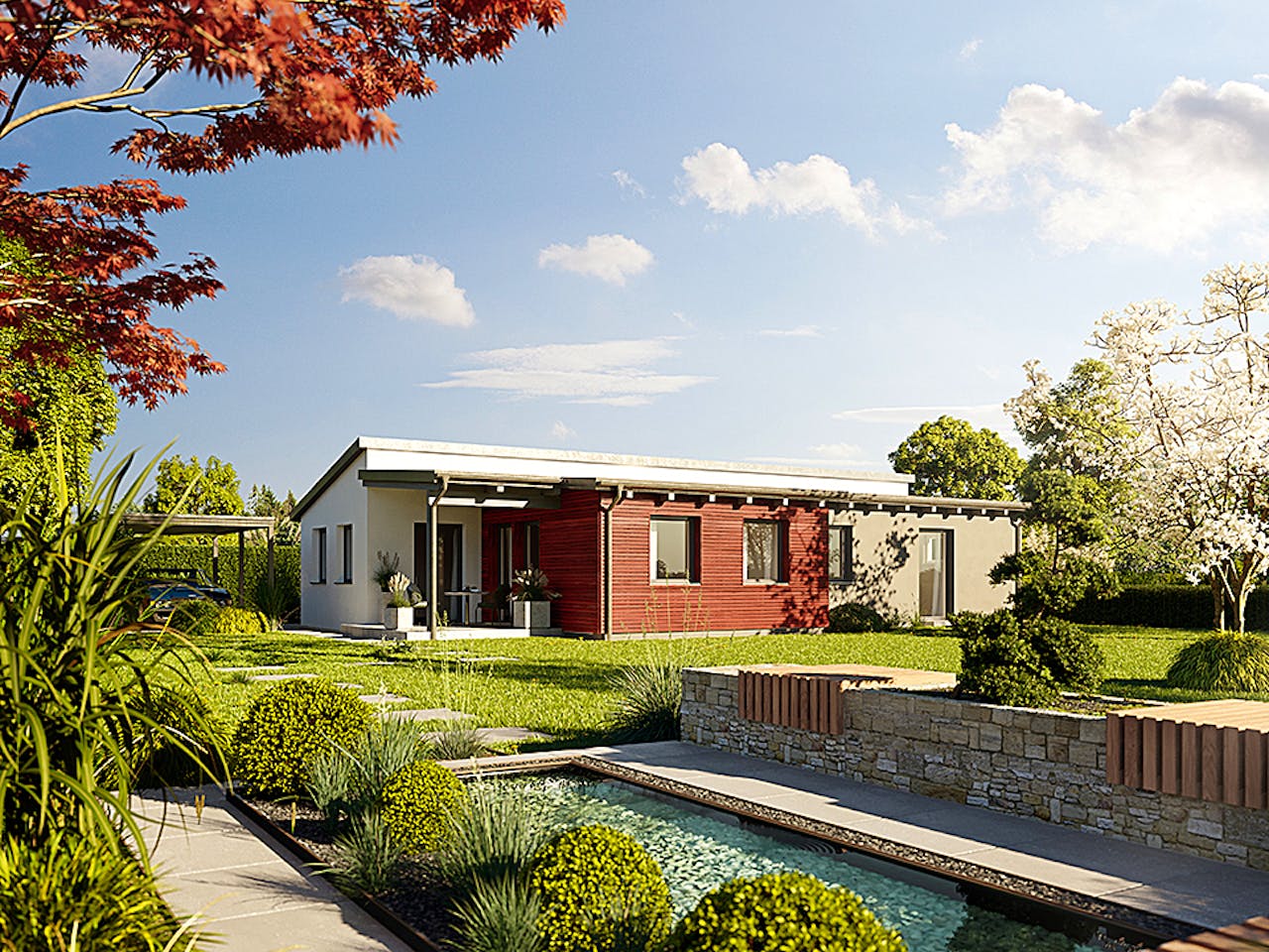 Stilprägend beim Entwurf Bungalow 109 ist auf den ersten Blick das auffällige versetzte Pultdach. Im Zusammenspiel mit einer farbenfrohen Fassadengestaltung verleiht es dem Haus einen modernen und lebhaften Charakter. Bei einem versetzten Pultdach bietet es sich an, die beiden Grundbaukörper des Hauses in unterschiedlichen Farben zu gestalten, so dass sich diese gut voneinander abheben. Je nach Stil können strahlend fröhliche Farben oder auch gedecktere Farbtöne zum Einsatz kommen. Bunt wird es auf Wunsch auch bei der Gestaltung der Innenräume. Lassen Sie Ihrer Kreativität freien Lauf und gestalten Sie den offenen Wohn-, Ess- und Kochbereich sowie die Schlaf- und die Badräume nach Lust und Laune. Auf 109 m² sind Ihren Ideen keine Grenzen gesetzt.