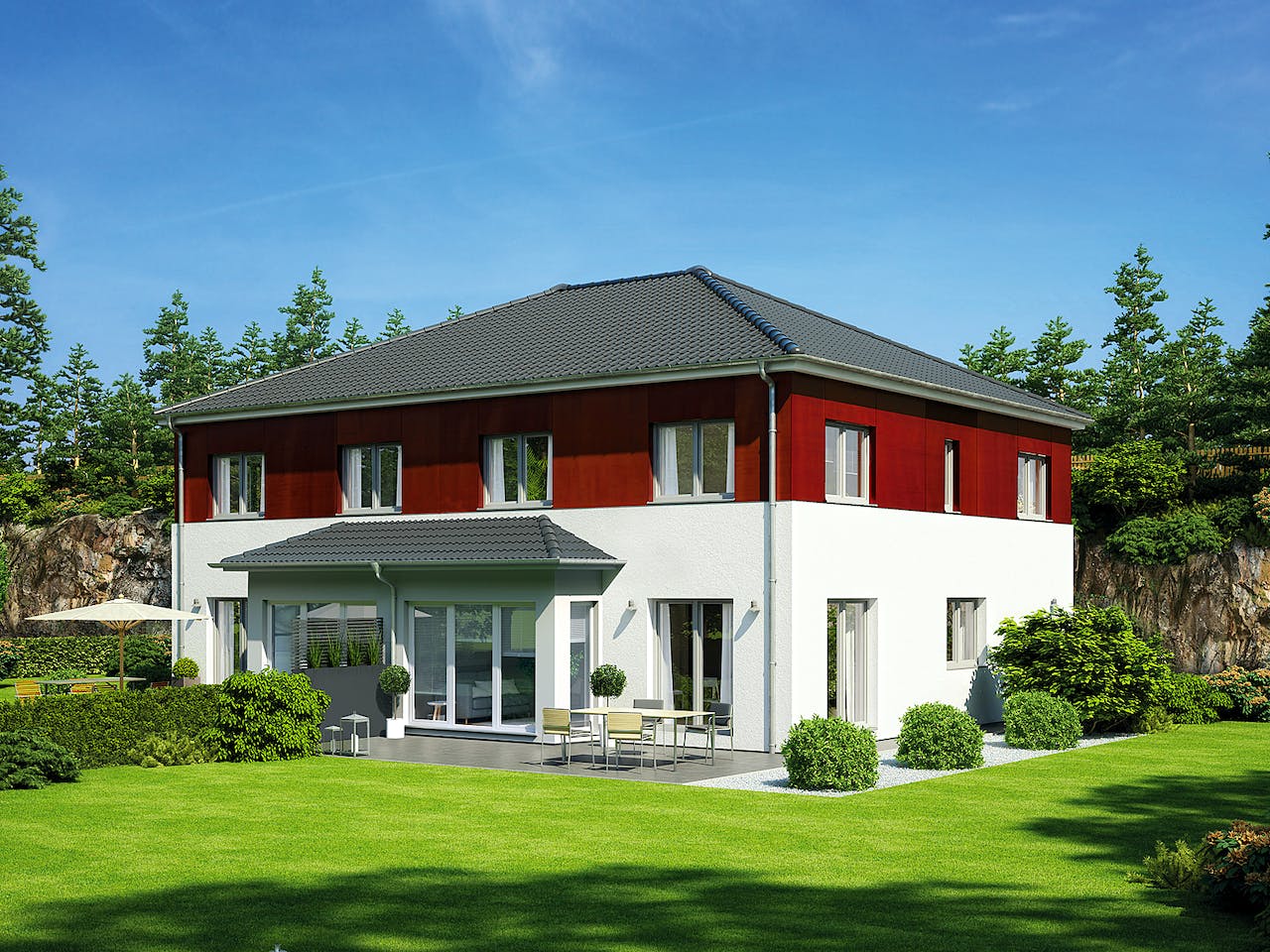 Mit seinem flachen Walmdach bildet das Doppelhaus 139 die ideale Basis für vielfältige Gestaltungsmöglichkeiten. Ob im klassischen Villenstil mit dezenten Farbtönen und Faschen um die Fenster, im mediterranen Look mit kräftigen, erdigen Farben oder ganz modern mit einer Kombination aus weißem und farbigem Putz – verleihen Sie Ihrem Haus doch einfach Ihre ganz persönliche Note. Im Innenbereich ist auf zwei Vollgeschossen genügend Raum für Ihre Ideen. Der offene Wohn-, Ess- und Kochbereich kann auf Wunsch mit einem Wintergarten erweitert werden.