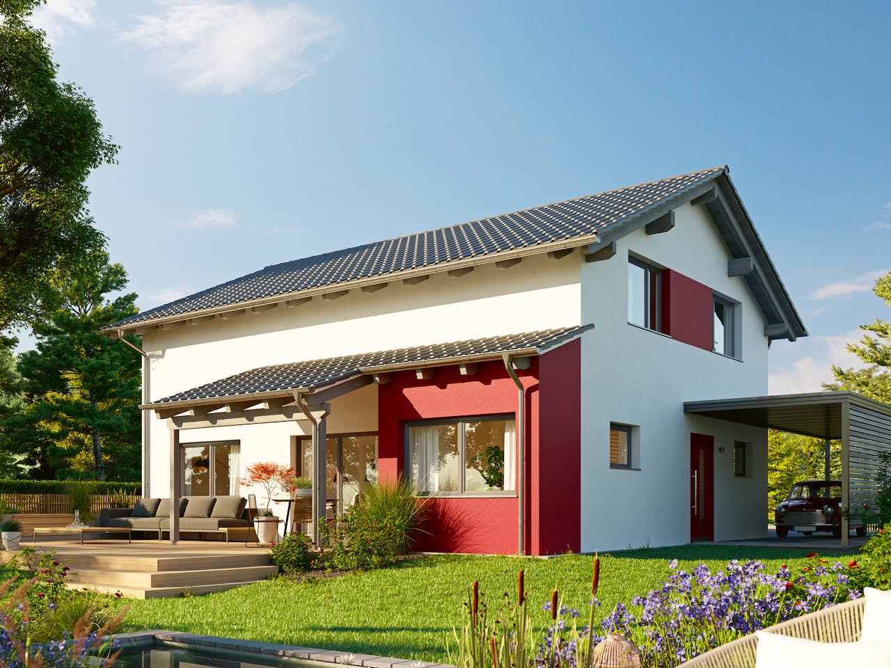 Waren bis vor einigen Jahren noch überwiegend gedeckte und eher zurückhaltende Farbtöne am Haus angesagt, darf es heute gerne kräftig und auffällig zugehen. Ein reines Weiß, kombiniert mit starken Kontrastfarben wie z. B. Rot oder Grau, verleiht einem Variant 25 einen tollen, modernen Look, der in der Nachbarschaft garantiert die Blicke auf sich zieht. Und innen? Da geht es auf Wunsch farbenfroh weiter. In unserem Ausstattungszentrum zeigen wir Ihnen gerne, welche Wirkungen Farben haben und wie man sie gezielt einsetzen kann, um eine Wohlfühlatmosphäre zu schaffen.