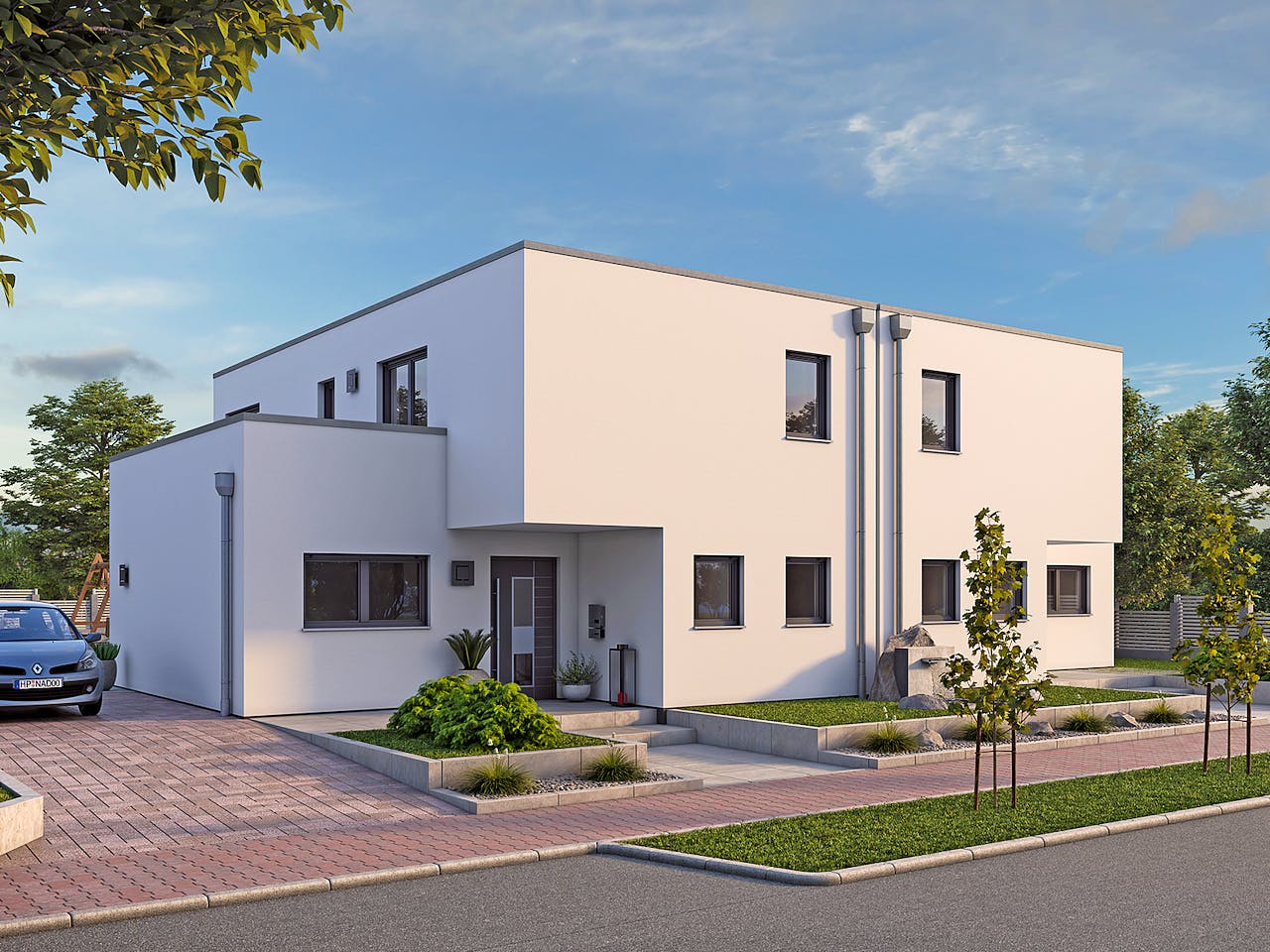 Das modern gestaltete Doppelhaus im Bauhausstil ist mit seiner schlichten Symmetrie und ein echter Hingucker. Geschosshohe Fenster erzeugen ein gemütliches Ambiente. Die sachte Trennwand zwischen den Terrassen der beiden Doppelhaushälften bietet ausreichend Ruhe für einen gemütlichen Abend im Kreise der Familie. Jedoch steht auch einem gemeinsamen Grillabend mit den Nachbarn und Freunden nichts im Wege.