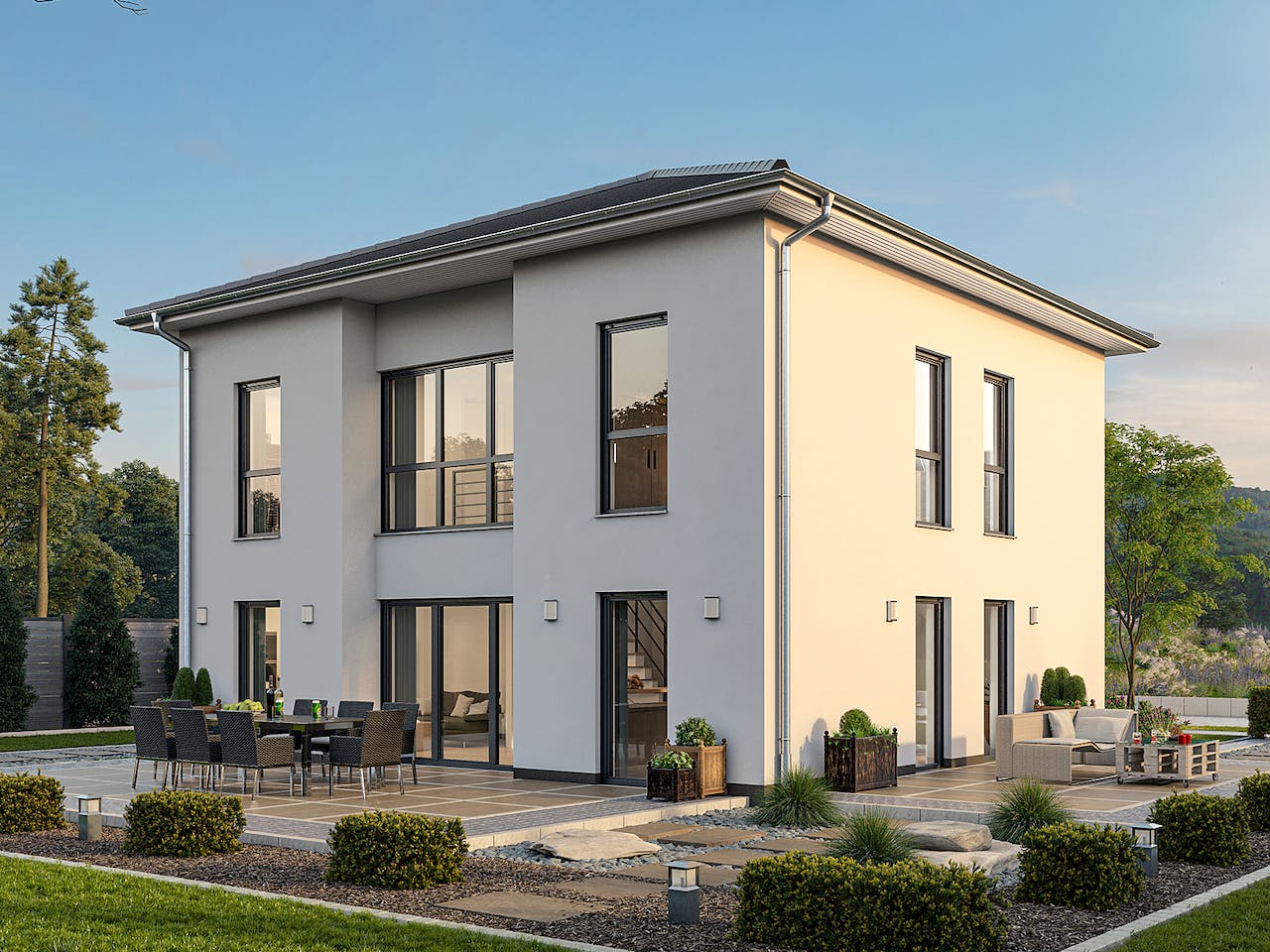 Diese Stadtvilla ist vollmassiv und wird mit Massivdach gebaut. Durch die Bauweise mit geschosshohen Systemwandelementen aus Porenbeton steht der Rohbau innerhalb weniger Tage und die Bauzeit verkürzt sich gegen- über der herkömmlichen Stein-auf-Stein Bauweise. Das Massivdach ist ein weiterer Vorteil, den Sie an heißen Sommertagen – und den darauf folgenden Nächten – besonders zu schätzen wissen.