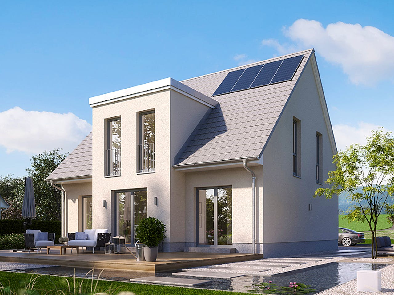 Mitten im Leben, mitten im Haus - Sie wollen lieber direkt ankommen und bevorzugen eine offene Gestaltung? Dann begrenzen Sie den klassischen Hausflur und nutzen Sie den Platz für's tatsächliche Wohnen, mit mehr Licht und weniger Türen. Knapp 150 qm Wohnfläche mit 3 Zimmern im Dachgeschoss. Das Master-Schlafzimmer bietet genügend Platz für einen begehbaren Kleiderschrank. Wie Ihr Haus aussehen soll entscheiden Sie allein - wir stehen helfend mit Rat und Tat parat. Steht Ihre Planung wird zum Festpreis gebaut und das immer massiv.