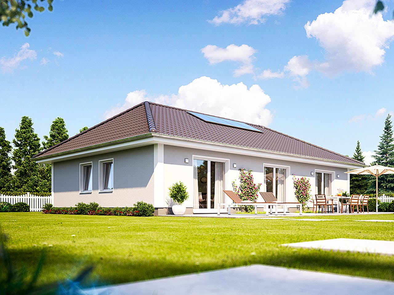 Klassisch, elegant und zeitlos schön. Diesem klassischen Bungalow mit 110 qm stehen dezente Akzente. Ganz Ihr Stil? Wir gehen den Grundriss mit Ihnen im Detail durch und verleihen Ihrem Haus Ihre ganz persönliche Note. Sie profitieren dabei von unserer jahrzehntelangen Expertise in der Konzeption und Umsetzung von Massivhäusern und Bungalows im Besonderen. Unsere Häuser sind massiv, mit modernster Technik ausgestattet und aus hochwertigen Materialen gebaut. Verraten Sie uns Ihre geheimen Details fürs Haus - Wir erfüllen Ihren Taum!