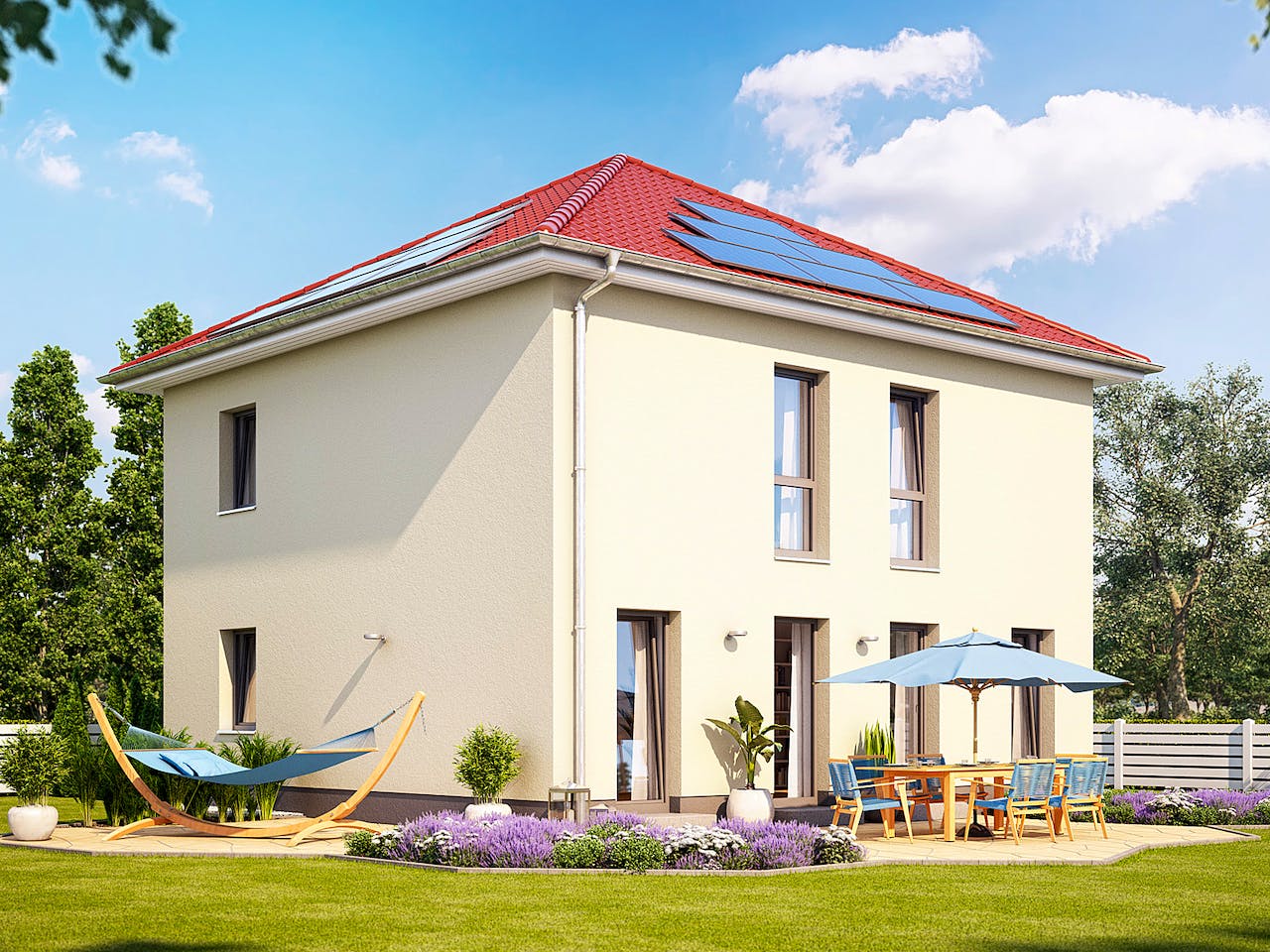 Eine klimafreundliche Stadtvilla mit knapp 130 m² von Heinz von Heiden. Verteilt auf zwei Vollgeschosse befinden sich 5 Zimmer, eine große Küche, ein Duschbad und ein WC. Schon die einladene Diele der Stadtvilla Arcus 13K verdient einen Pluspunkt. Noch dazu erfüllt die Stadtvilla alle Anforderungen an ein Klimafreundliches Haus. Das Arcus 13K ist nachhaltig und besonders energieeffizient. Zu der modernen Haustechnik gehören: eine Lüftungsanlage mit Wärmerückgewinnung, eine Wärmepumpe und eine PV-Anlage mit Speicher