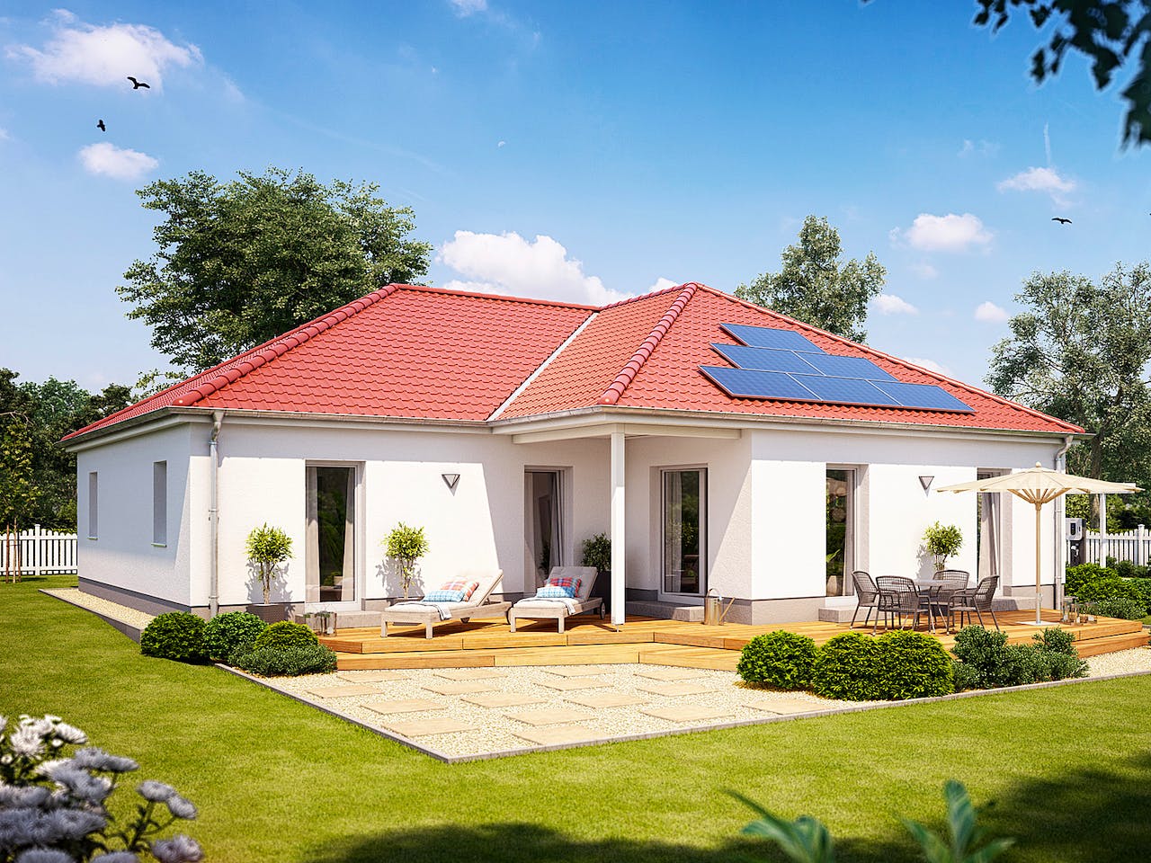 Dieser Bungalow ist ganz besonders und dazu auch noch klimafreundlich. Mit dem Cumulus W77K entscheiden Sie sich für ein echtes Traumhaus. Das Highlight ist vor allem der besondere Grundriss. Bei der Planung wurde auf ausreichend Platz zum Wohnen und Wohlfühlen geachtet. Das Haus besticht insbesondere durch die moderne Haustechnik. In dem Haus eingeplant sind eine Lüftungsanlage mit Wärmerückgewinnung, eine Wärmepumpe und eine PV-Anlage mit Speicher (18 Module). Somit können Sie bei diesem Haus auch davon profitieren, dass es alle Anforderungen für die KFN-Förderung "Klimafreundliches Bauen" erfüllt.