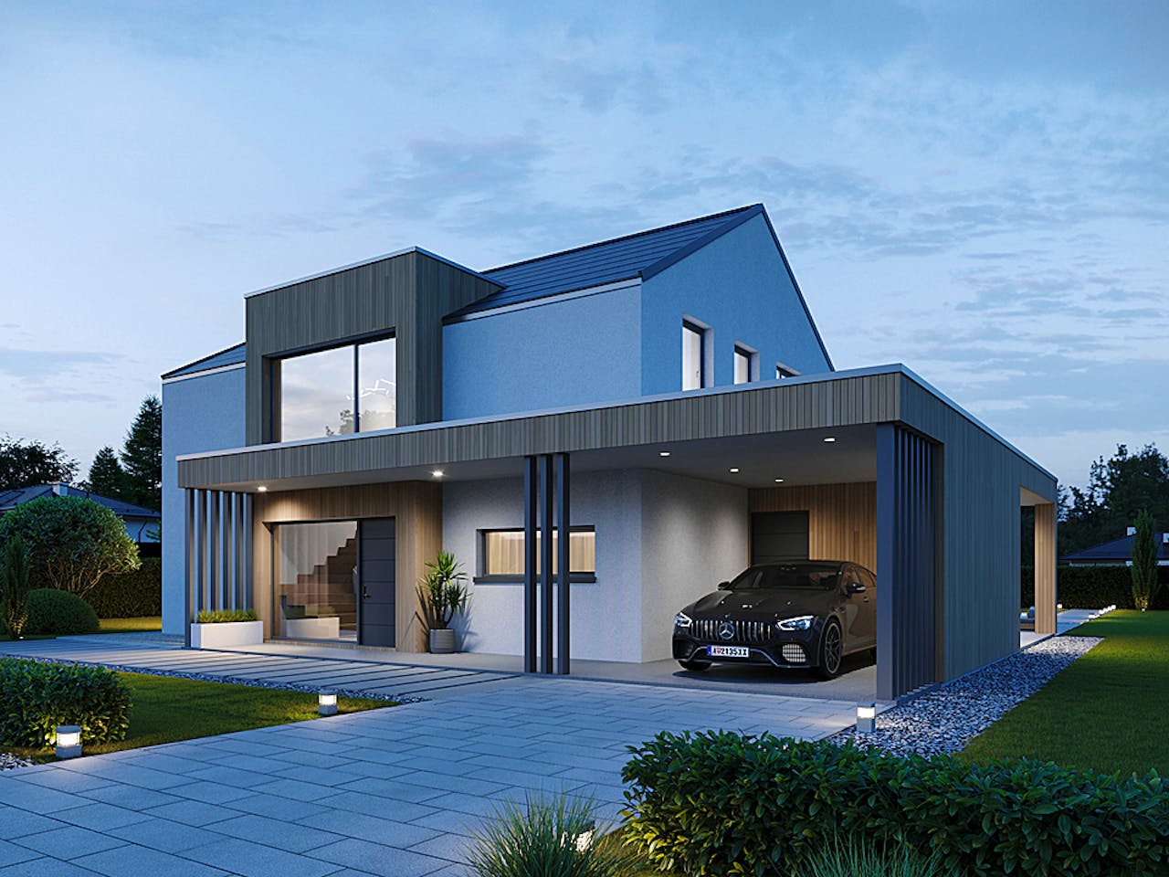 Das Concept 2 begeistert durch seine klare Linienführung und den harmonischen Einsatz natürlicher Materialien. Die ansprechende Architektur verbindet auf elegante Weise Holz und Glas, die sich nahtlos in die schlichte, weiße Fassade einfügen.